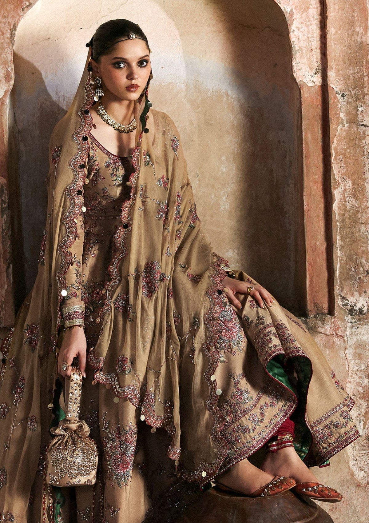 Beige pishwas is a regal creation, composed with Korean raw silk embroidered floral bunches with embroidered borders while the maroon pink Korean raw silk churidar balances the look with bold contrast. The chiffon dupatta with embroidered floral bunches adds richness. This attire blends elegance with grandeur, making it an ideal choice for weddings