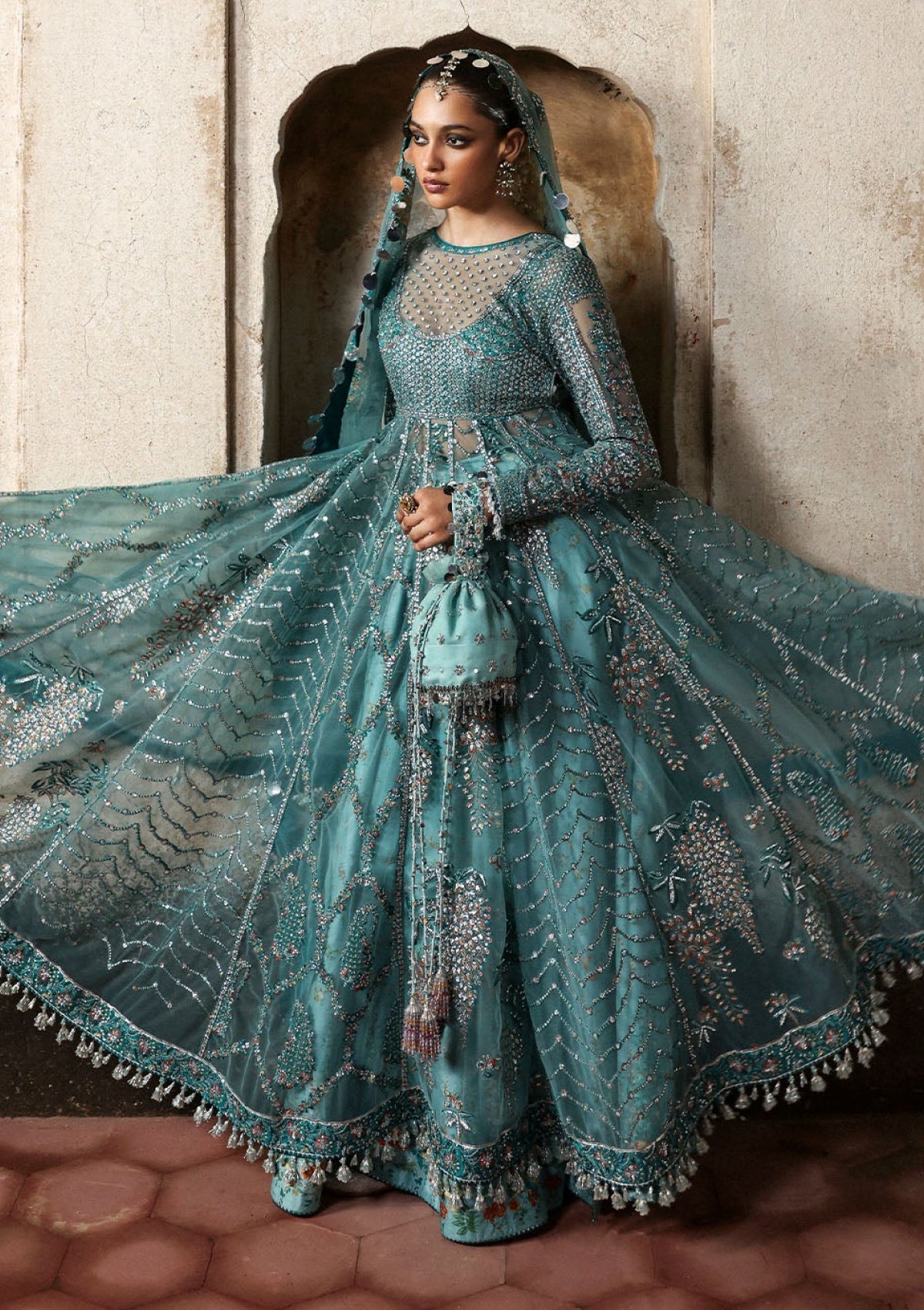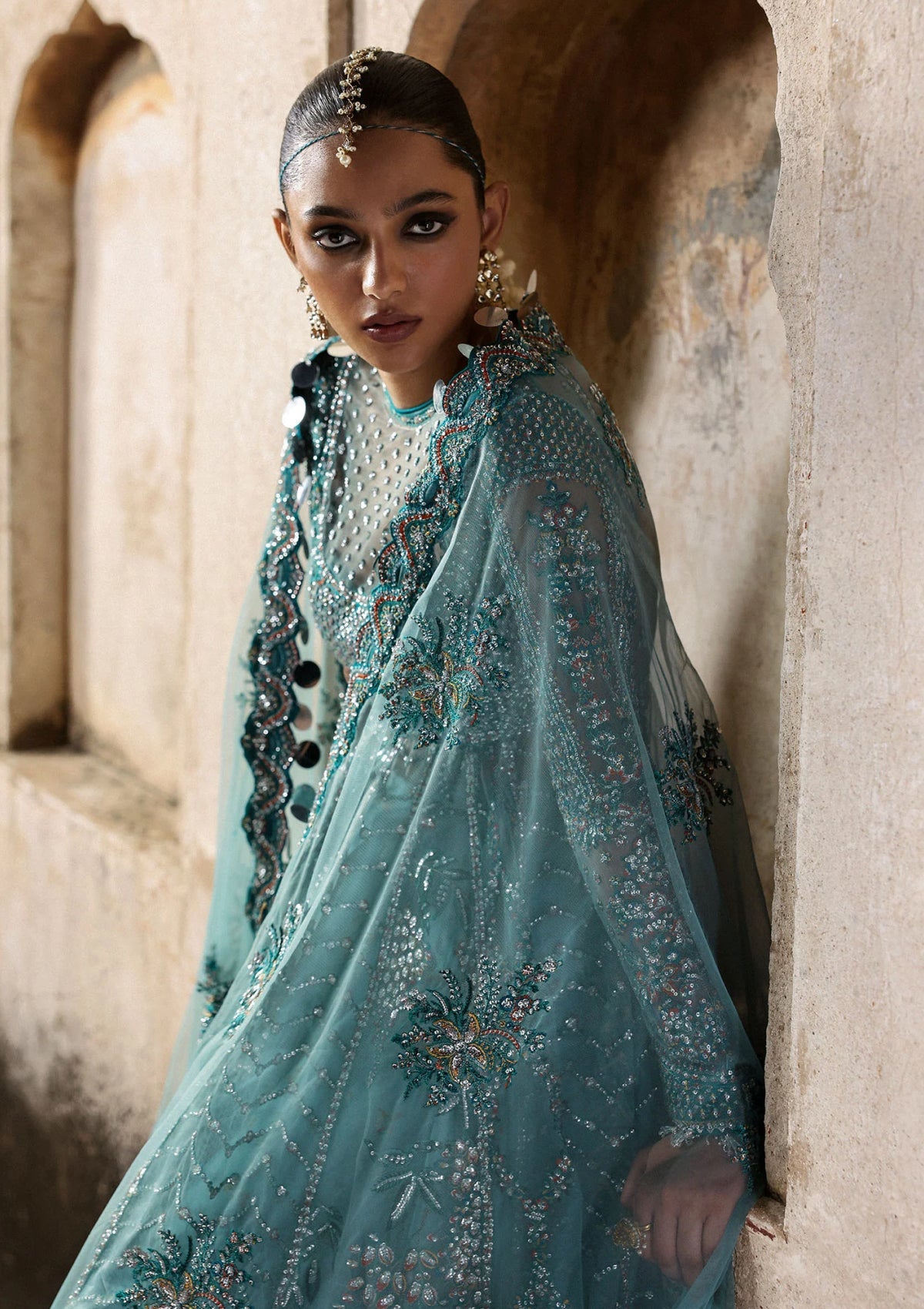 Ice blue net pishwas is delicately adorned with three different embroidered sequin panels and sleeves, creating a dreamy and ethereal look. It is paired with a digitally printed Korean raw silk lehnga that enhances the outfit with a soft and graceful flow. The dupatta crafted in chiffon with embroidered borders on all four sides adds the perfect finishing touch. This attire is a version of elegance and charm