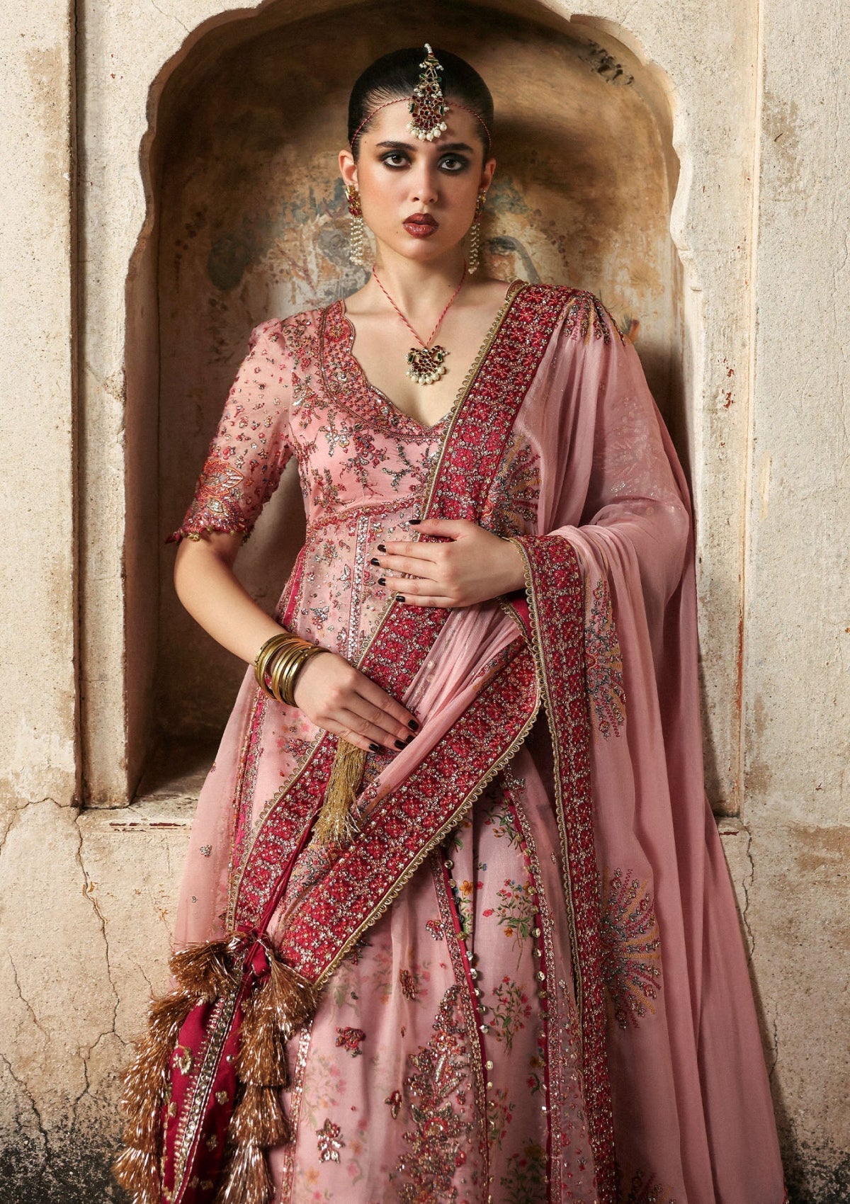 This pink organza shirt with front open pishwas is designed with embroidered panels on front and back, highlighted with embroidered sleeves and daman border that elevate its charm. Paired with a digitally printed Korean raw silk lehnga, this outfit adds a graceful appeal to finish the look. The chiffon dupatta is detailed with four side fuchsia pink embroidered borders. This attire is a harmonious blend of style and modern appeal