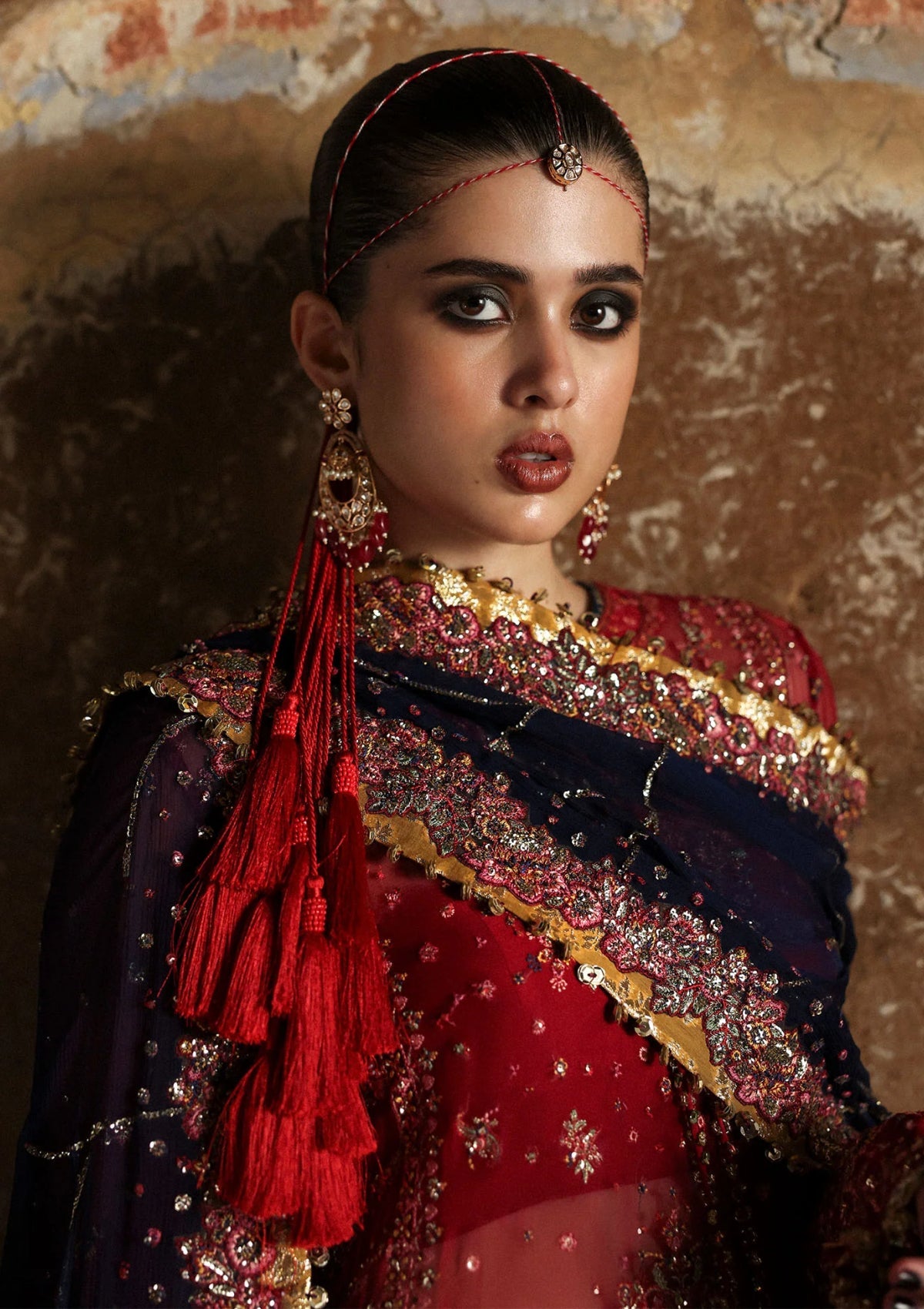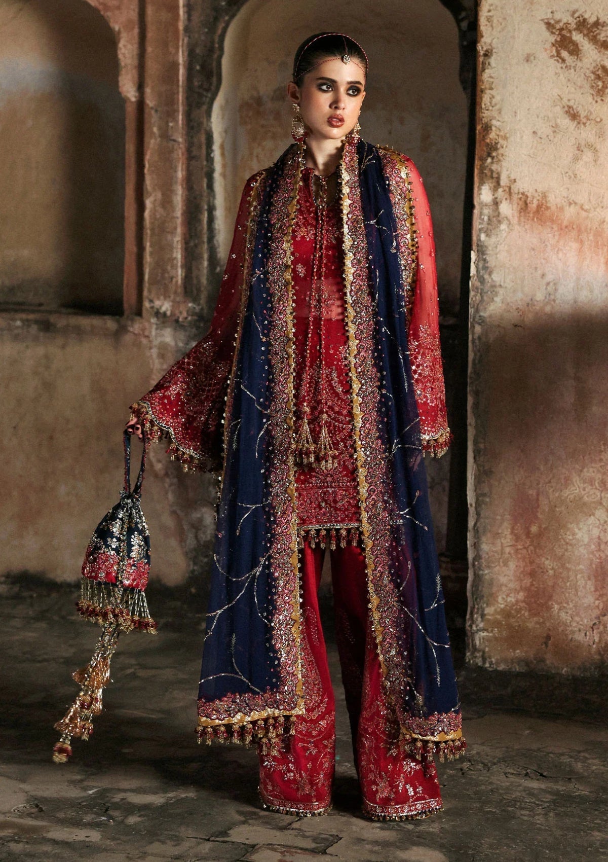Red chiffon shirt is designed with fully front and back detailed embroidered panels with embroidered sleeve borders. The Korean raw silk embroidered shalwar with embroidered paisleys on it. The chiffon embroidered dupatta with four-sided embroidered borders and embroidered jaal all over dupatta adds to its richness, while delicate embroidery enhances the outfit's festive charm. This dress is the true epitome of elegance and grace