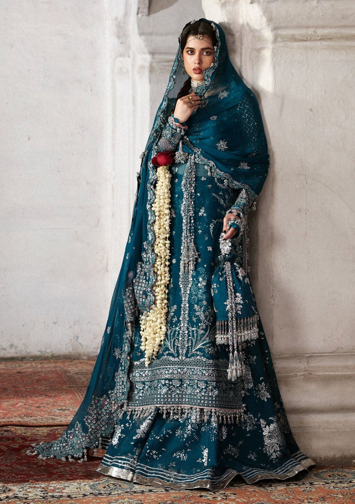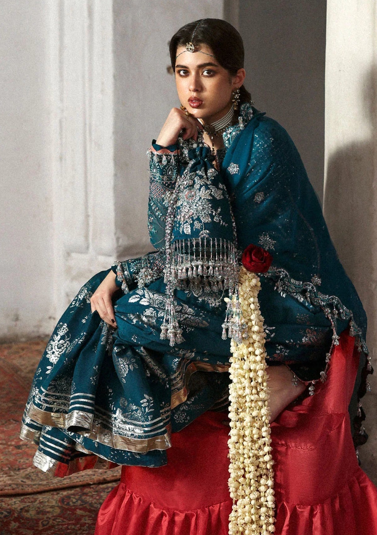 The teal organza shirt is beautifully crafted with intricate embroidery on both front and back panels, enhanced with embroidered borders. The screen printed Korean raw silk sharara adds a graceful and traditional appeal, while the embroidered dupatta with borders completes the look with elegance. This outfit is perfect for festive occasions