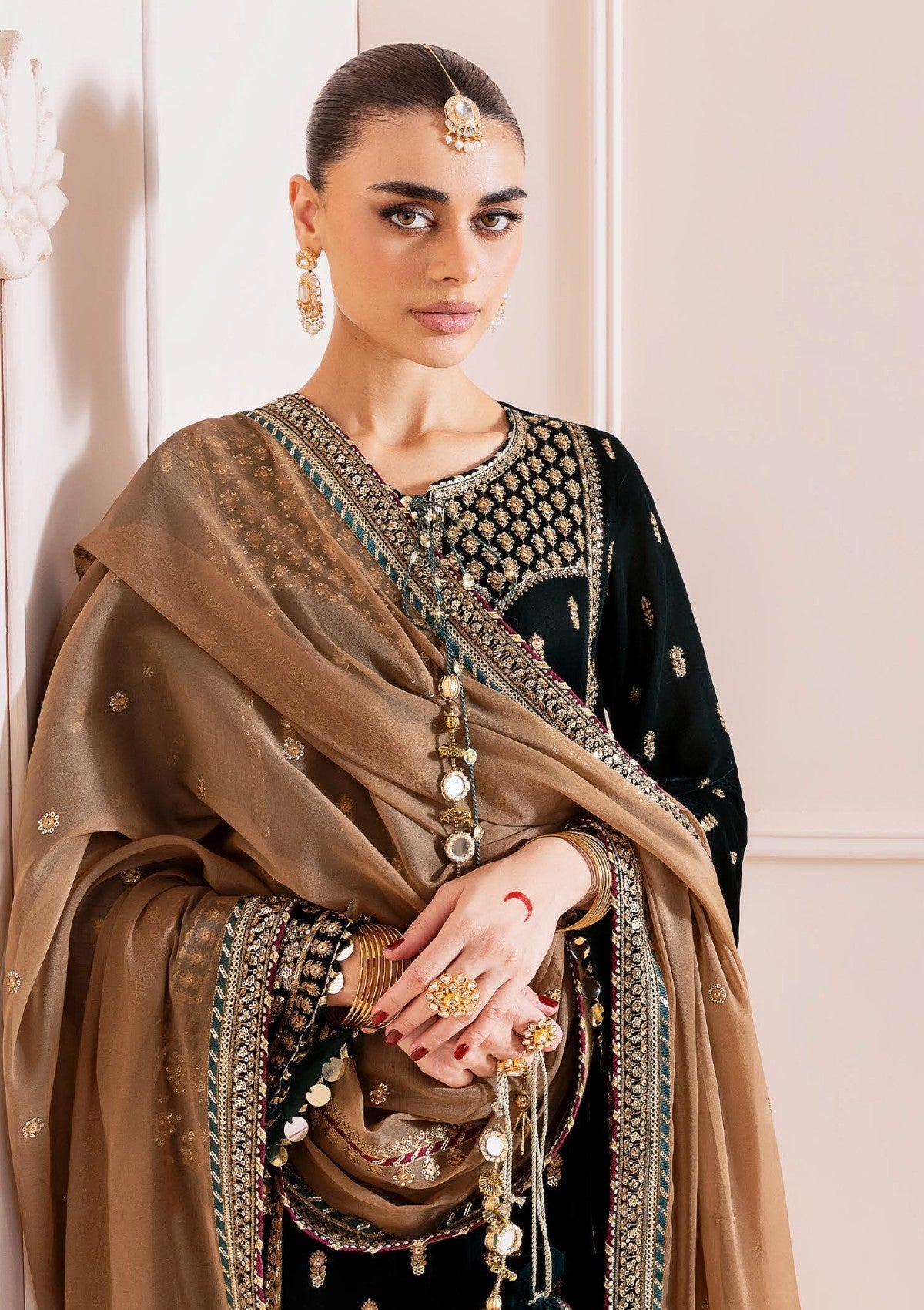 This sophisticated formal ensemble features richly embroidered pure velvet panels on the front and front sides, complemented by similarly embroidered velvet sleeves and borders on the front, back, and sleeves for a cohesive, luxurious appearance. The pure velvet back enhances durability and elegance, while the embroidered pure velvet bottom adds refined detail. Completing the look, the dupatta is crafted from organza with intricate embroidered applique and matching borders, combining texture and delicacy to elevate your formal wardrobe with expert craftsmanship and timeless style.