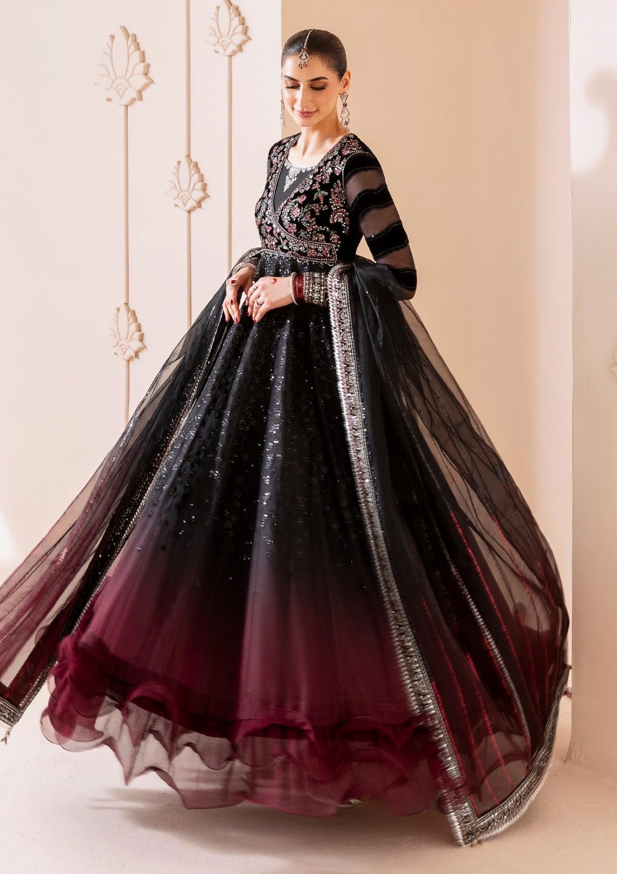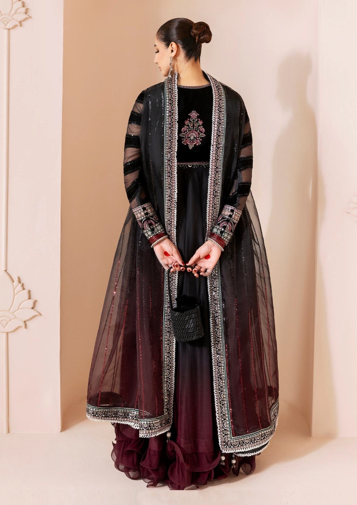 This formal outfit features an expertly crafted design with embroidered pure velvet on the front and back yoke, complemented by chiffon sleeves enhanced with laser technique embroidery. The front yoke combines embroidered chiffon detailing, while the front panels showcase digitally printed chiffon with intricate embroidery. A digitally printed organza dupatta with border accents completes the look alongside digital printed chiffon back panels and back yoke. The ensemble is lined with digital printed raw silk, offering a luxurious finish that balances elegance with refined craftsmanship.