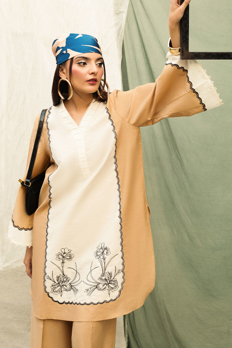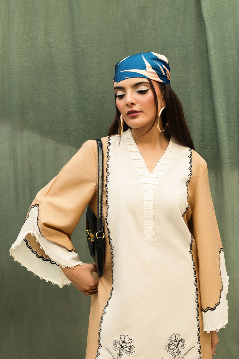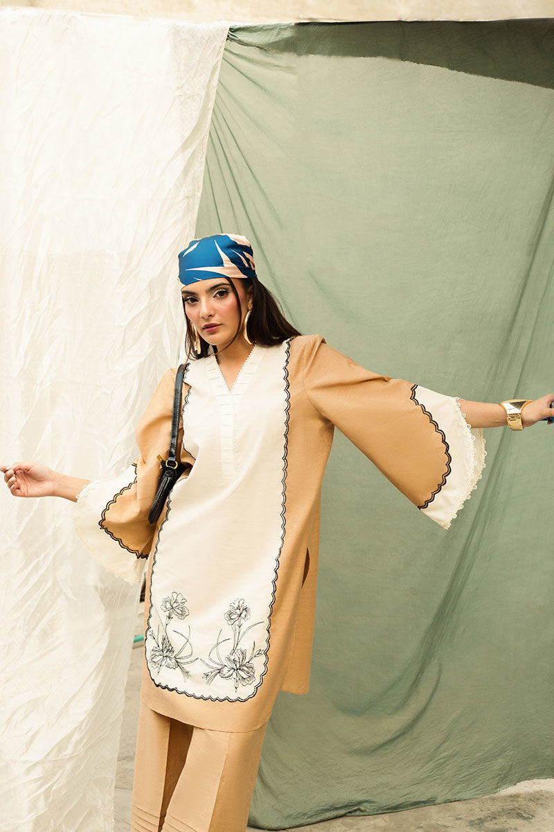 Chic and understated, this 2-piece beige and white cambric set features a knee-length shirt adorned with floral embroidery, patchwork, and lace inserts. Paired with pleated culottes, it's a graceful everyday look with refined detailing.