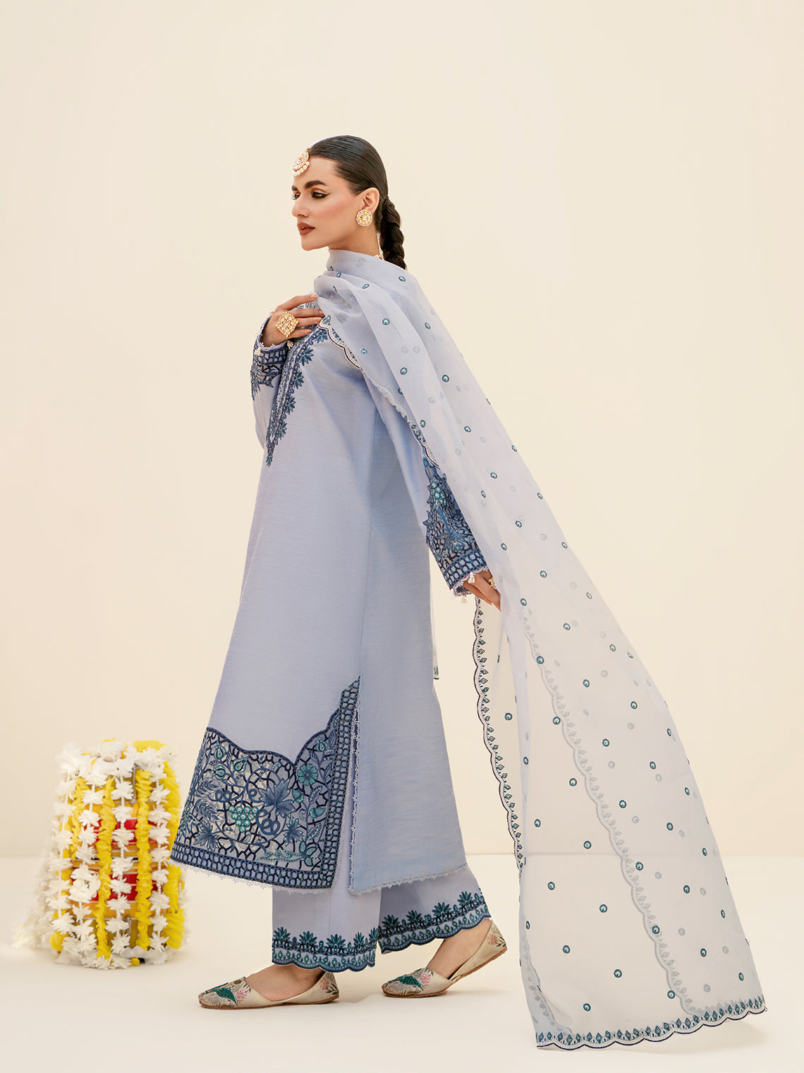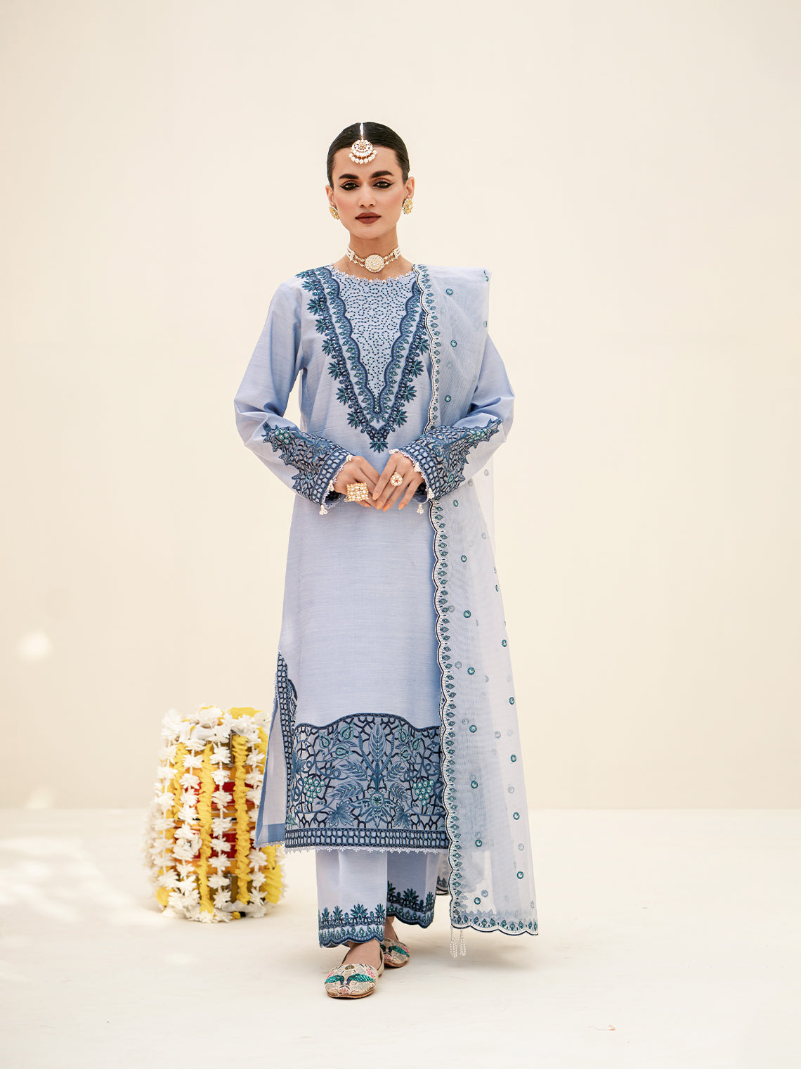 In an enchanting shade of blue, this ensemble features an amalgamation of bold embroideries with sequin details. Adding unique feminine charm to the look with its delicately designed neckline and sleeves enhanced with lace finishing. Paired with embroidered straight pants and a scalloped khadi net dupatta with delicate sequined embroidery.