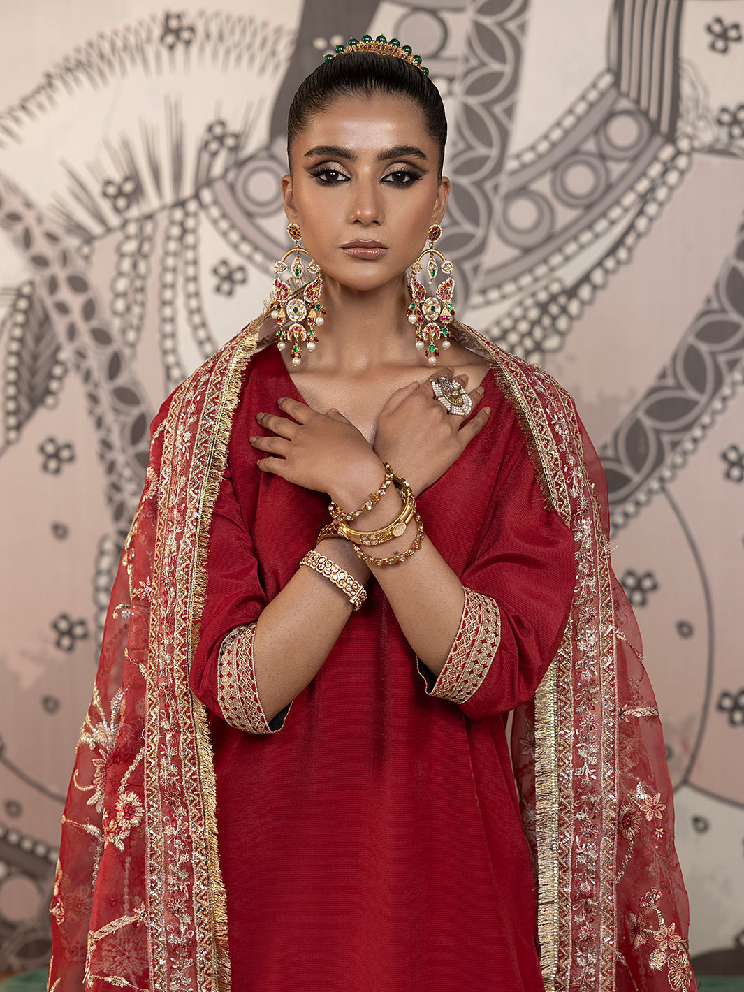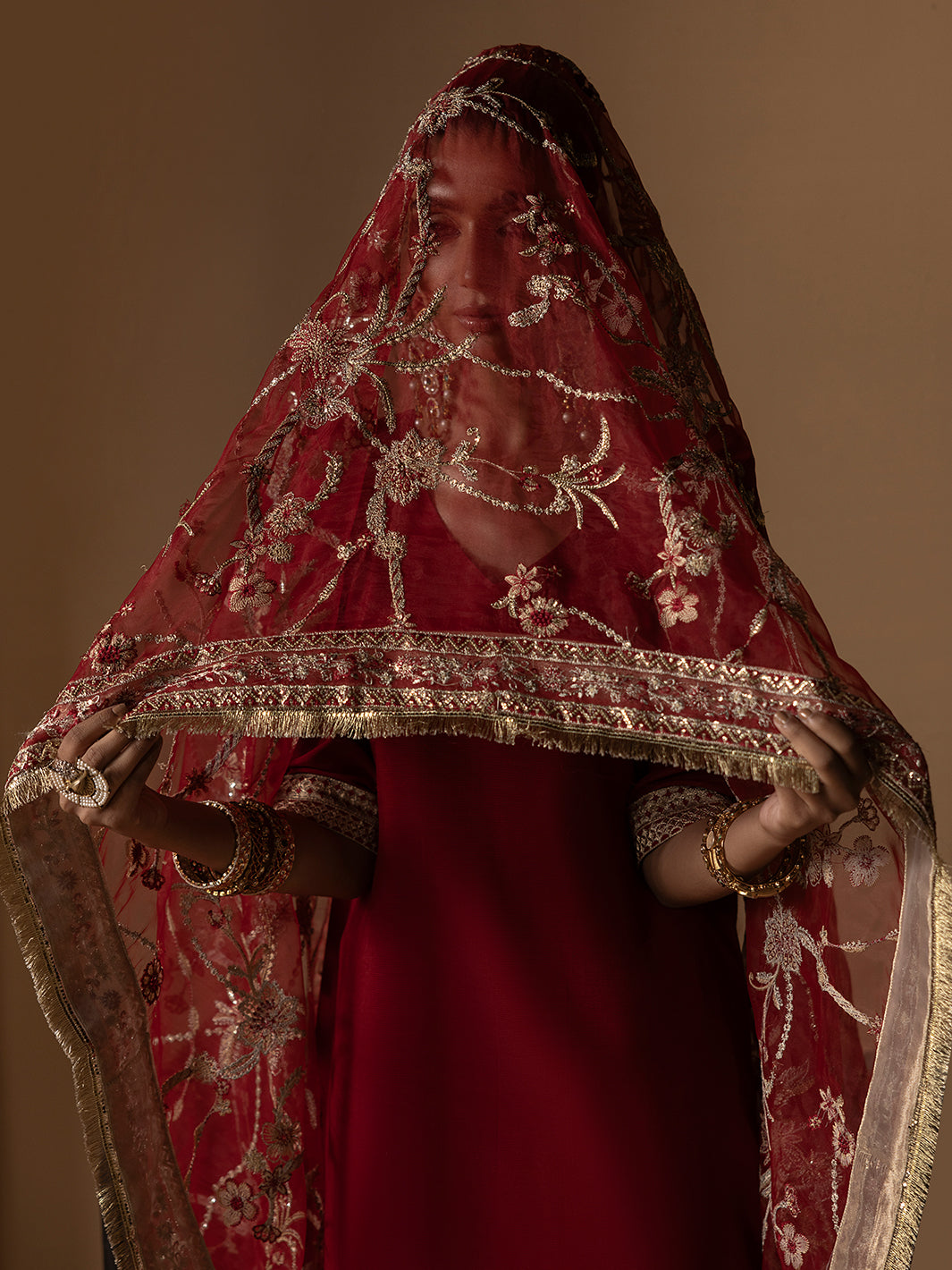 Red organza embroidered dupatta with four side