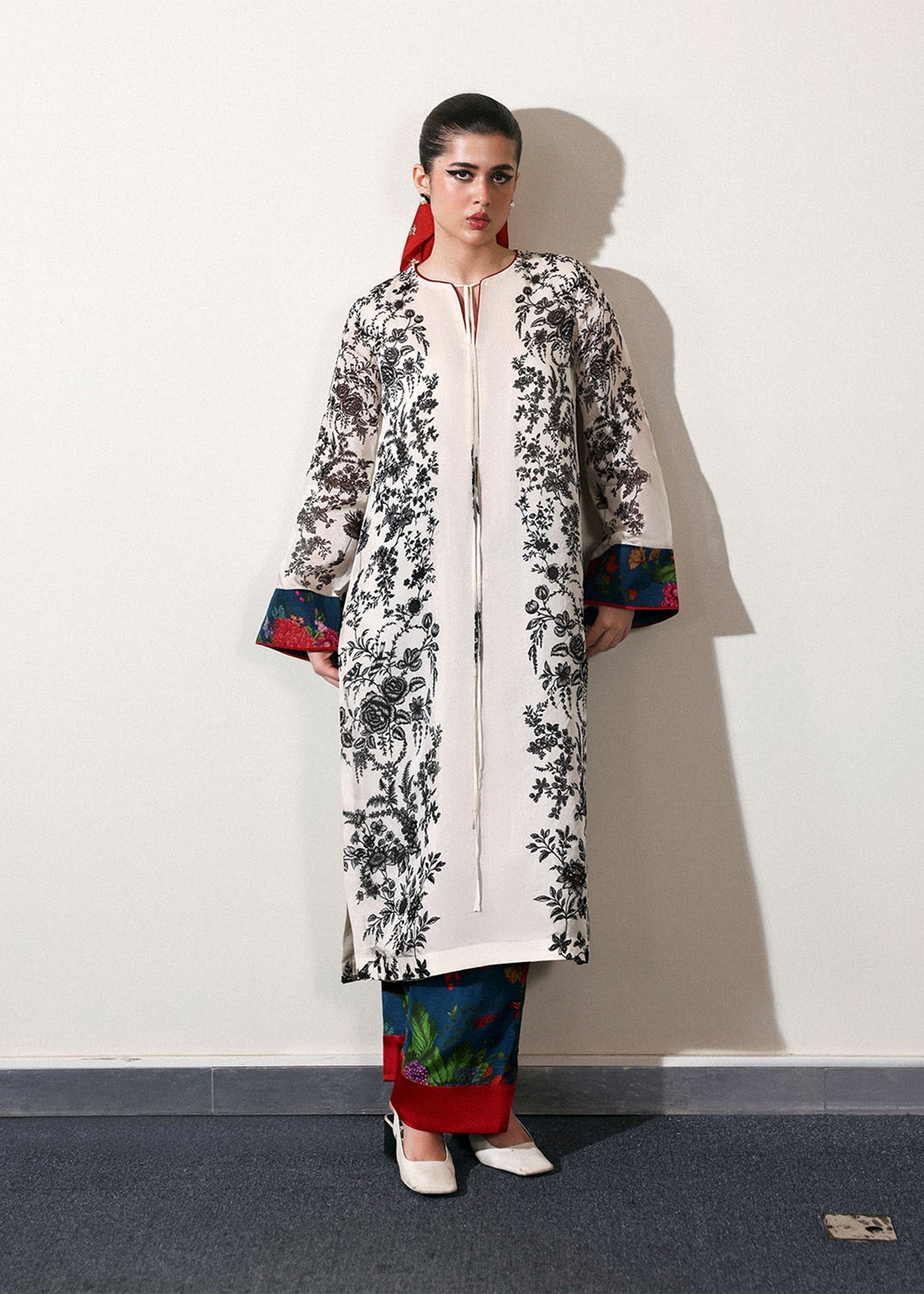 An ivory long shirt with sketchy black floral print, accented with red satin silk trims, printed tassel on the neckline and contrasting blue and red floral printed cuffs on the sleeves. Paired with matching blue and red floral printed pants, finished with a wide red satin silk border at the hem