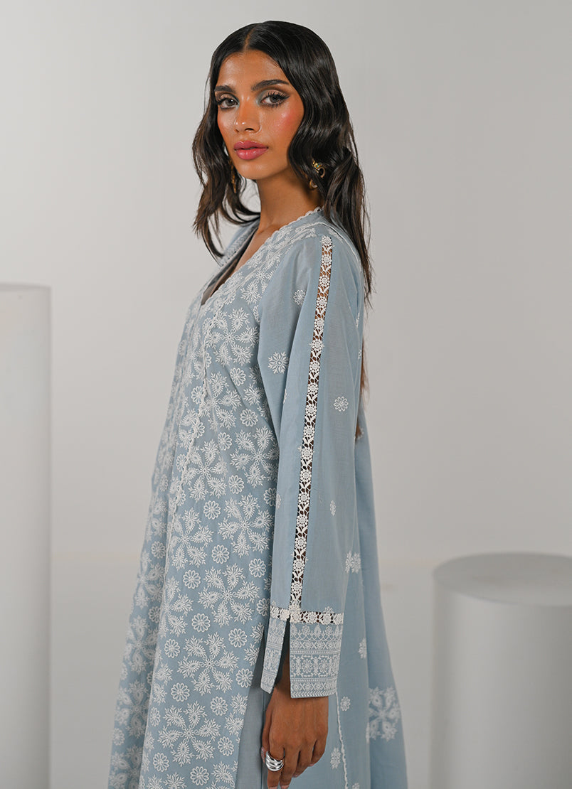Enjoy this light blue, cotton 3-piece embroidered suit from our Image Signature Collection. Featuring a beautiful V-neck and bell sleeves, it also boasts an intricately designed hemline, making it a perfect summer outfit.