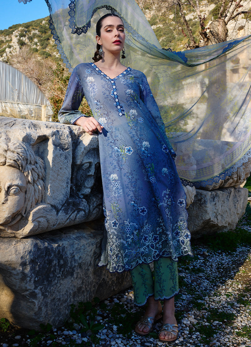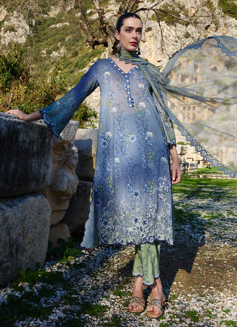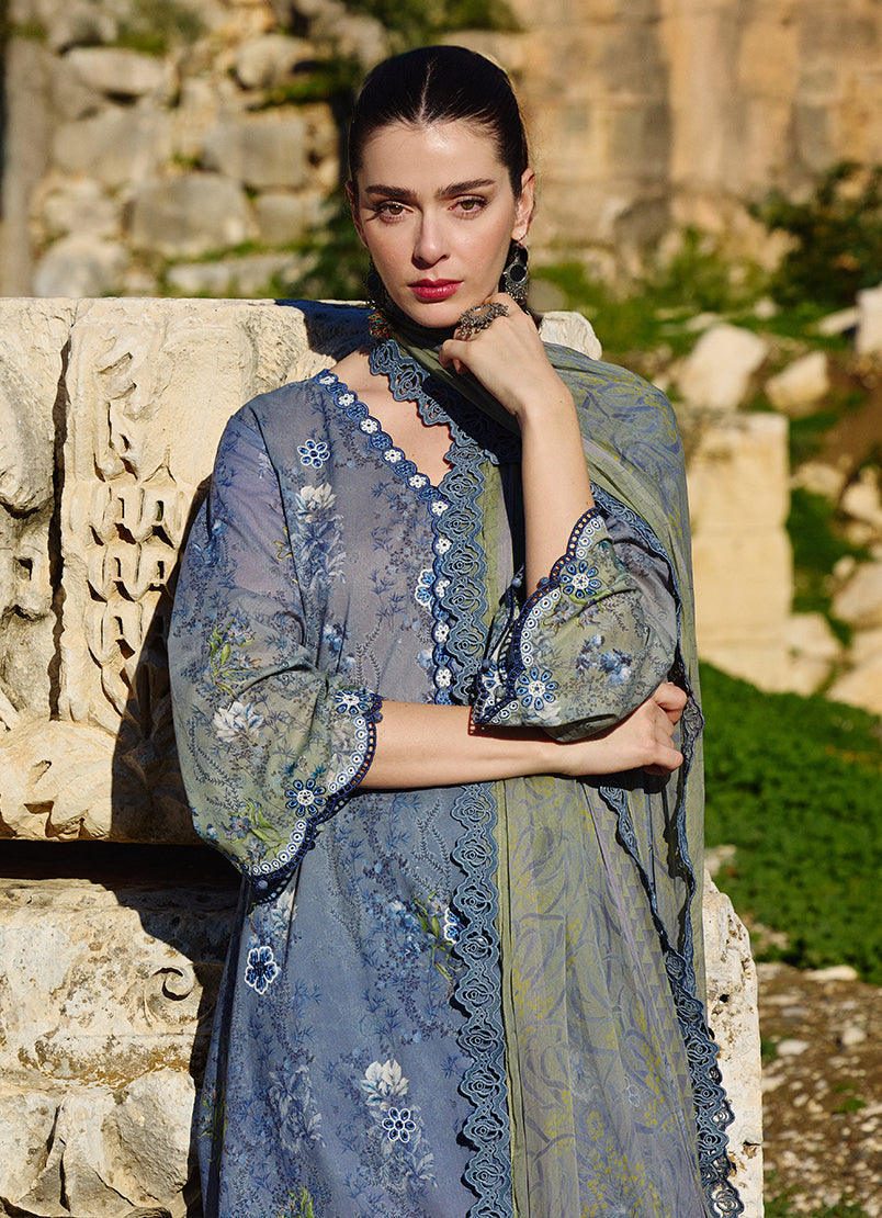 Efsun in Bluish Grey from our Spring Printkari '25 Collection. A printed cutwork embroidered cotton 3-piece outfit paired with digital printed chiffon dupatta.