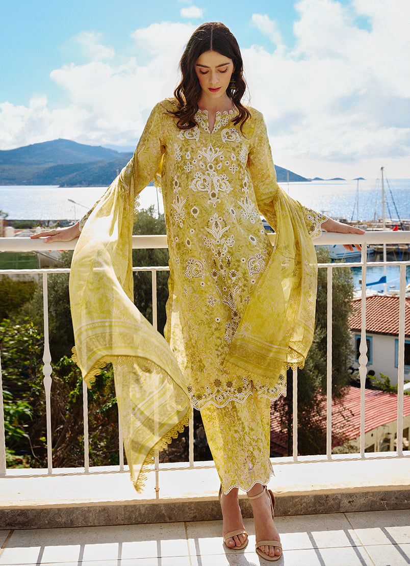 Leora in Yellow from our Spring Printkari '25 Collection. A printed cutwork embroidered cotton 3-piece outfit paired with digital printed chiffon dupatta. €‹