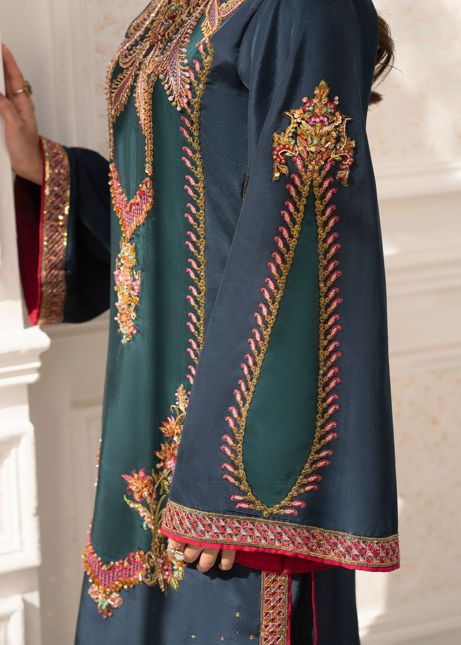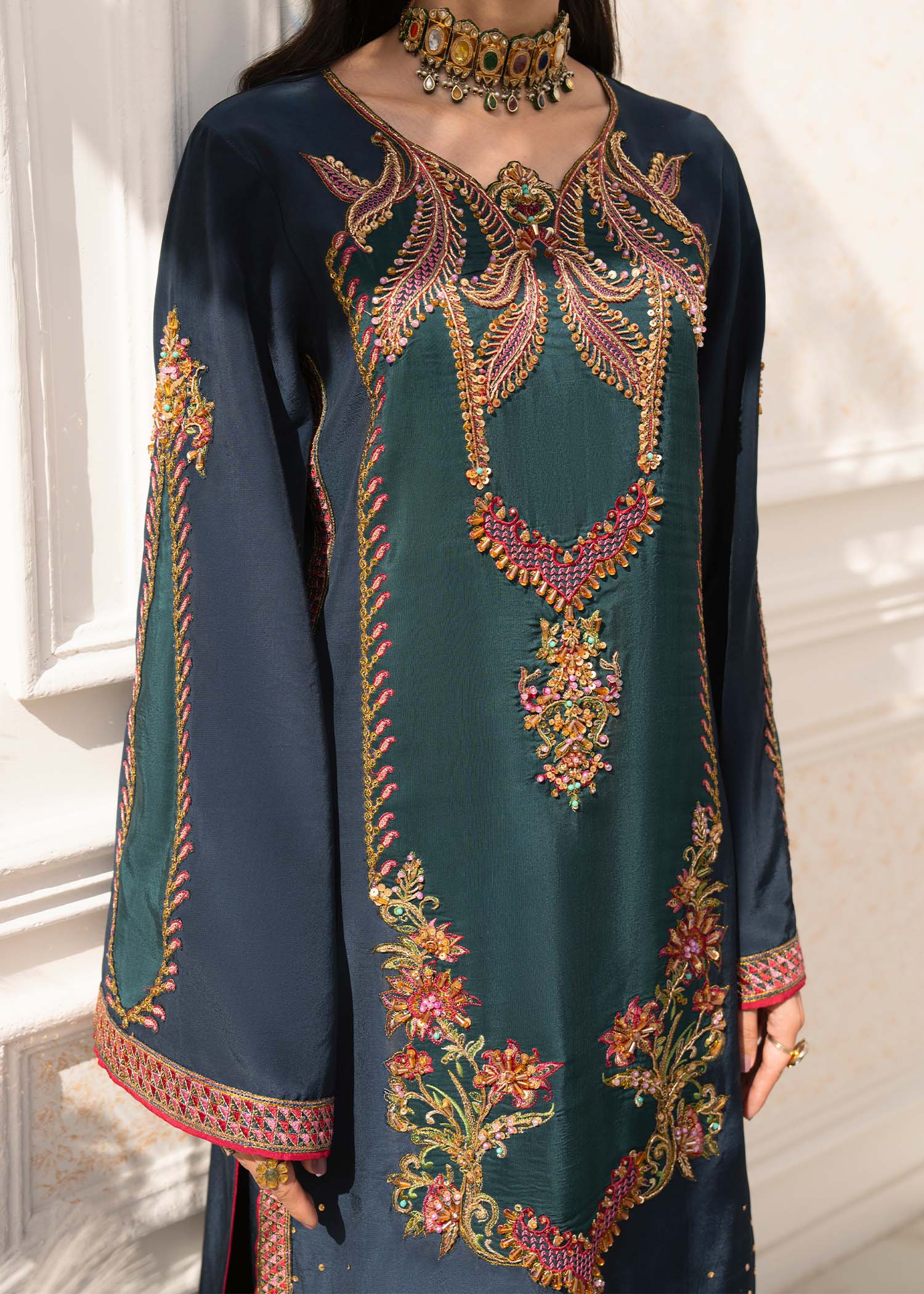 Rusian slik mid thigh length shirt embroidered beautifully with resham and zari hand embellished beautifuly with crystals pearls and naqshi pared with pk raw silk shalwar pants bling with contrasting organza embroidered dupatta.
