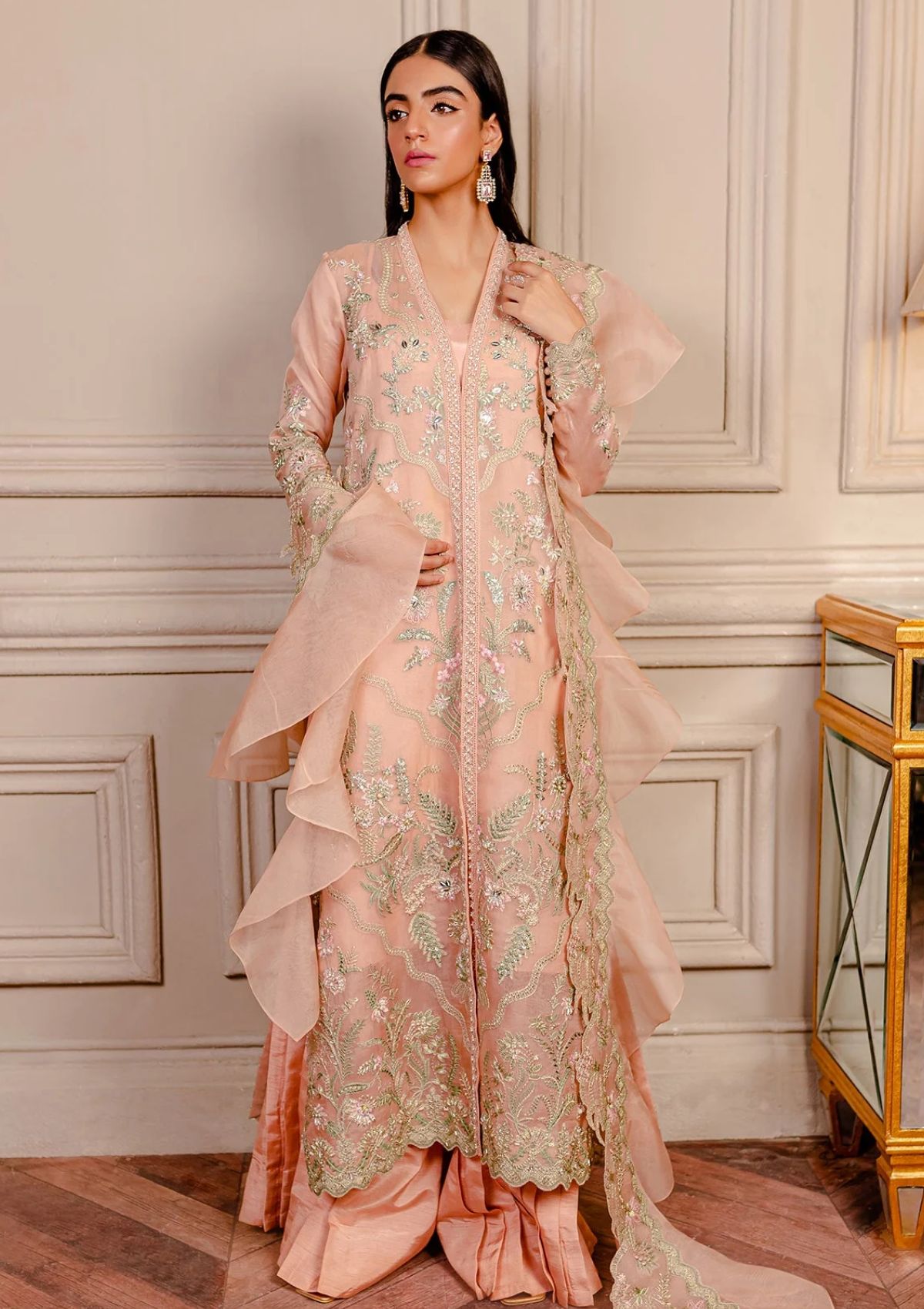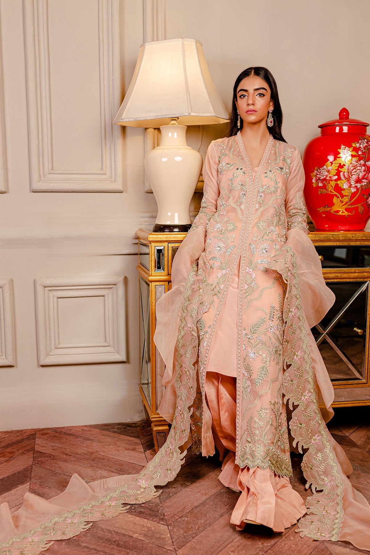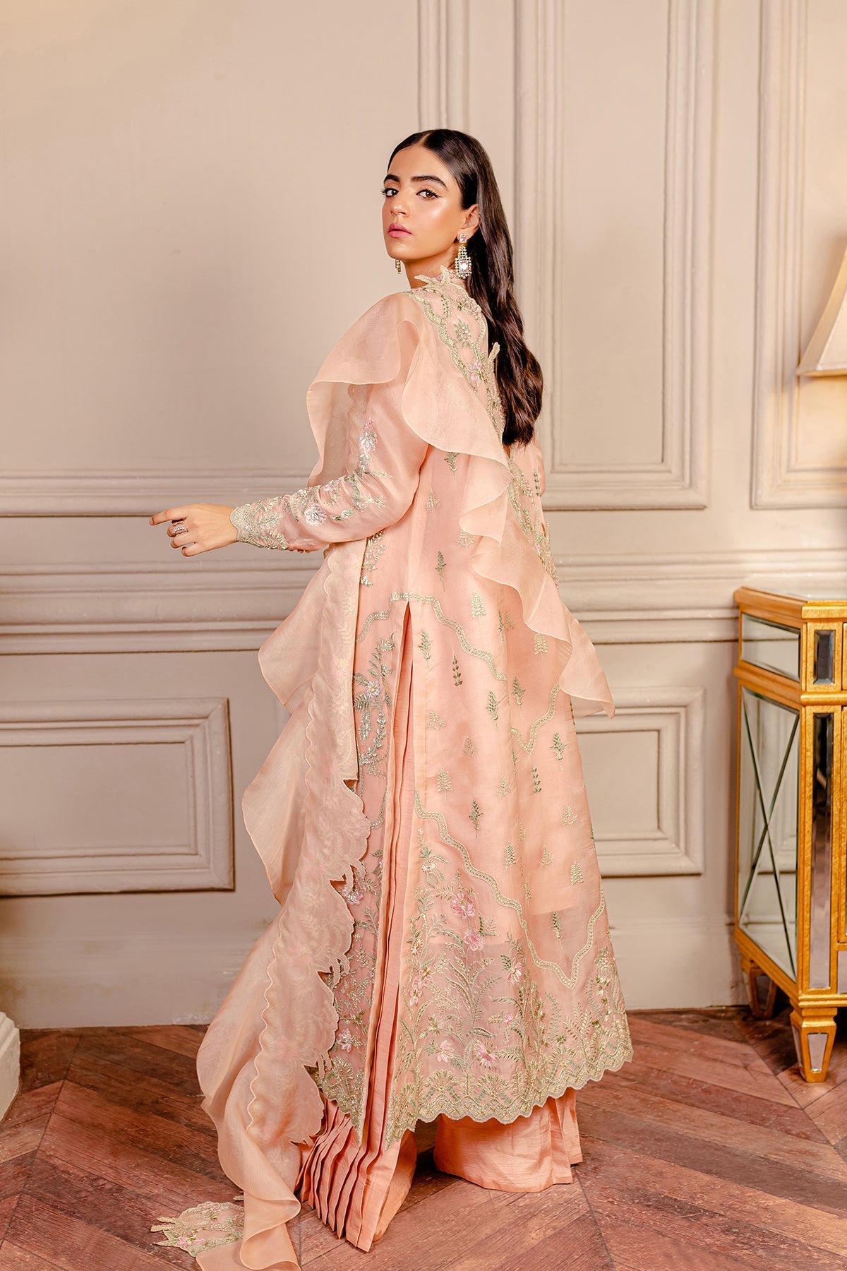 Beautifully craftedJuliet Peachshowcases the lushest of intricate floral embroideries and hand embellishments all over the font open gown. The fitted sleeves are magnified with FK signature buttons. Further enhance the look with a frilled, organza dupatta with its unique embroidered front finished with scalloped borders. Knife-pleated pants help complete the entire piece.