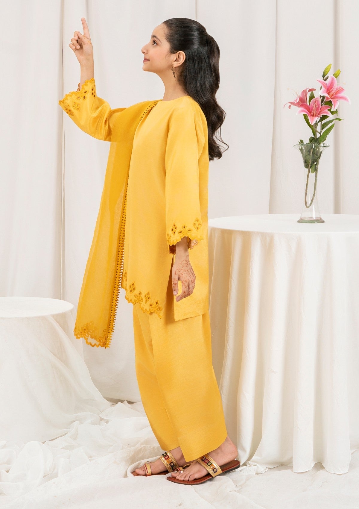 This mustard 3-piece embroidered silk dress for kids is a striking fusion ofelegance and tradition. Made from luxurious silk, the ensemble features a richlyembroidered shirt that showcases intricate patterns and fine craftsmanship. The warm mustard tone adds vibrancy and depth, making it a standout choice forfestive occasions and cultural events. Paired with coordinating silk trousers and abeautifully detailed dupatta, the outfit offers both comfort and sophistication.Perfect for weddings, formal dinners, or festive gatherings, this dress is designedto make a lasting impression with its bold color and graceful detailing.