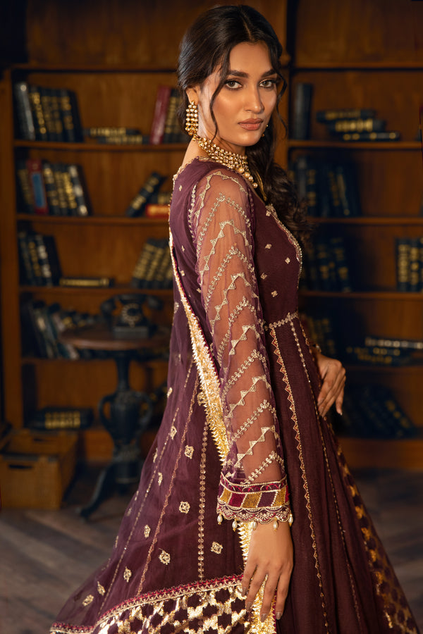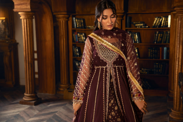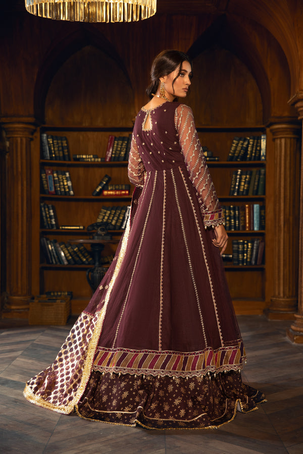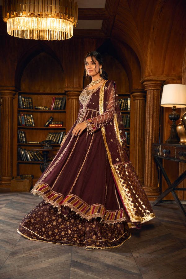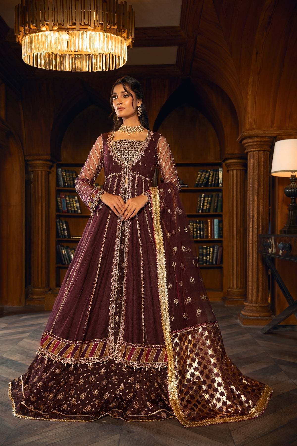 A plum net embroidered gown with raw silk screen printed lehenga is a luxurious and elegant outfit. Completing the ensemble is an organza jacquard and net embroidered dupatta adding a touch of grace and sophistication to the overall look.