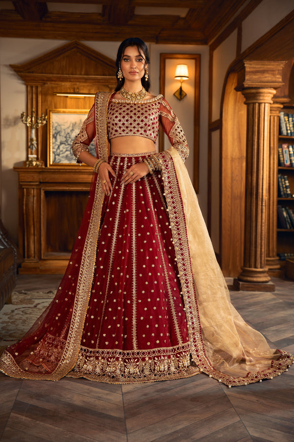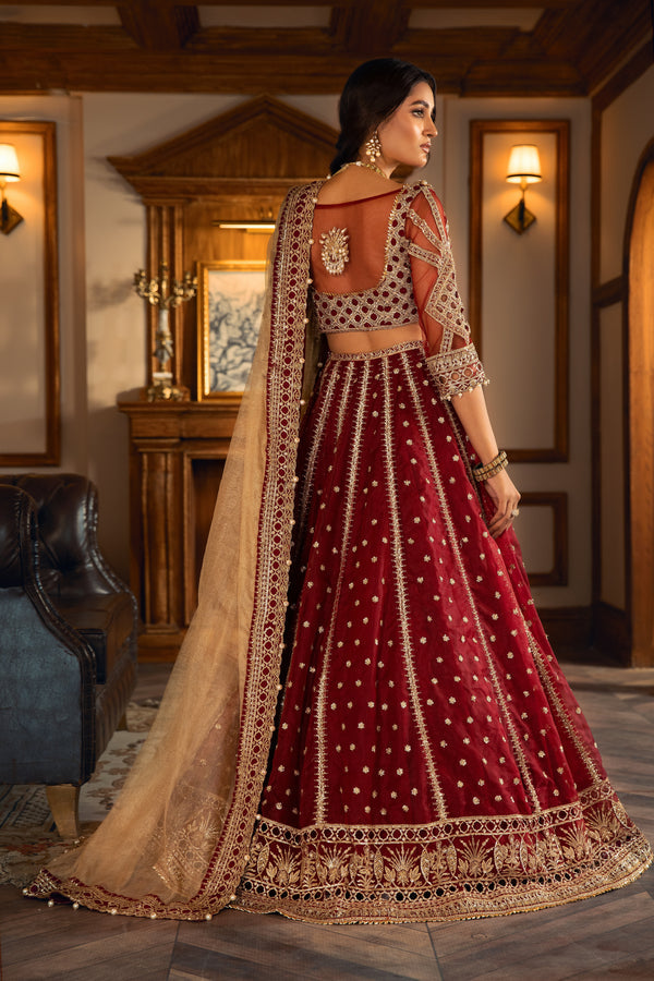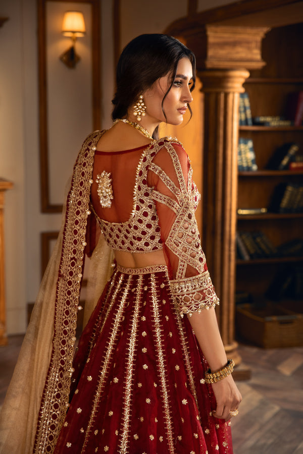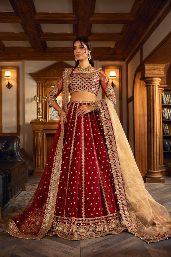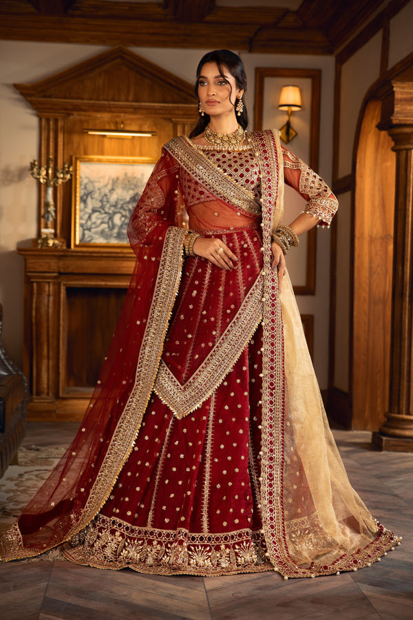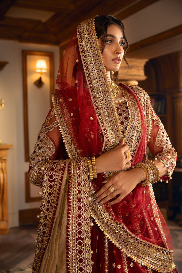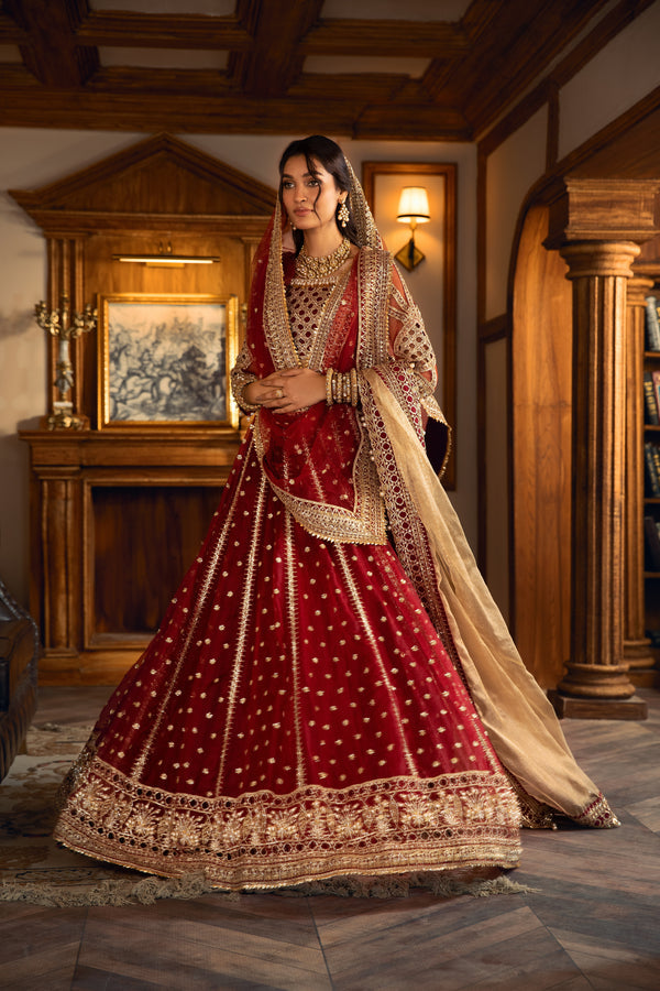 A Classic floor length silhouette is the epitome of elegance and glamour. Its vibrant, crimson hue commands attention and exudes confidence. Crafted from the finest materials, rendered in glowing tilla, gotta, sequin, beads and intricately detailed hand embellishments in the vibrant hues of gold. This gorgeous ensemble is a symbol of luxury, making a bold and unforgettable statement for your special day.