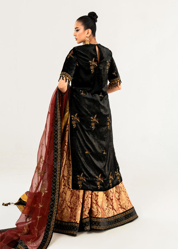 A luxurious, open-front shirt crafted from black shimmer velvet and intricately embellished with crystal-cut beads and Swarovski crystals. The design showcases a pattern-aligned dabka edging, with layers of meticulously placed baitki in a crane motif. The gown is adorned with short sleeves, each accented by long, black tassels for a touch of drama. Paired with it are three-panel jamawar azaar pants, featuring a black shimmer velvet base with delicate embroidery. The ensemble is completed by an embroidered organza dupatta, framed by a four-sided velvet border.