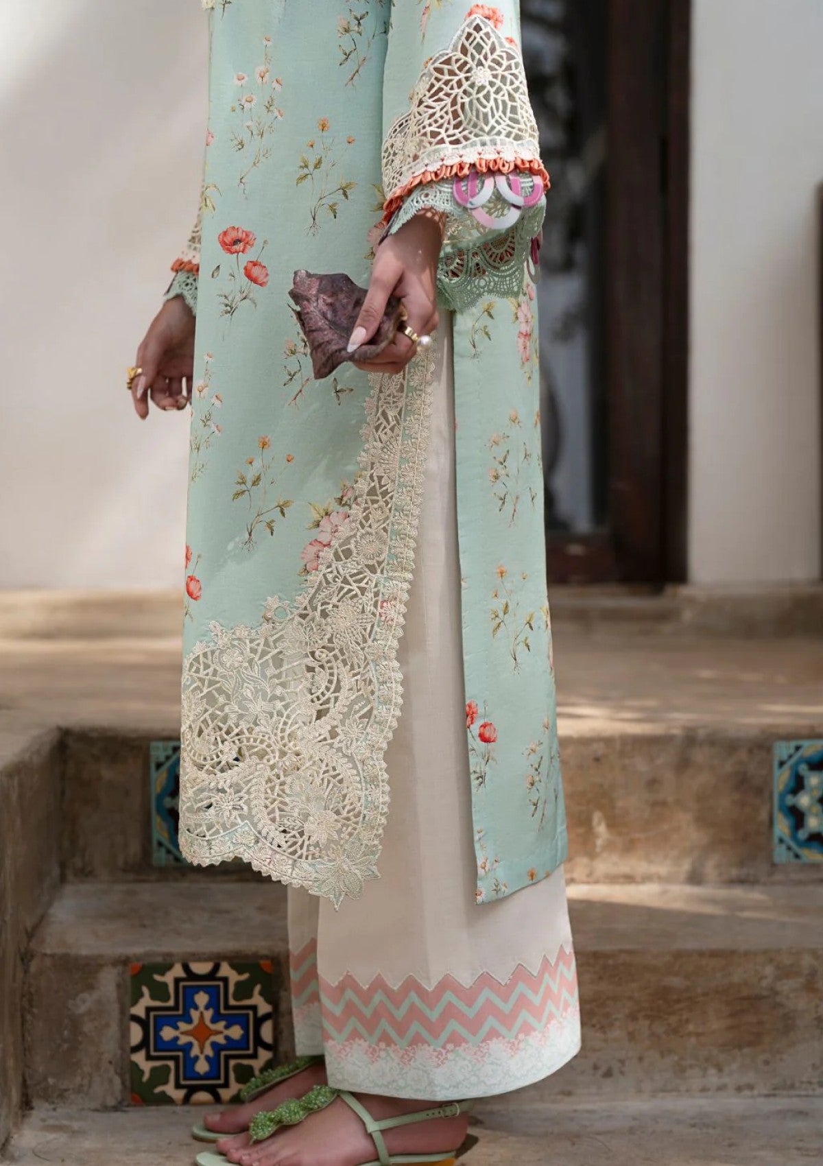 Summer style craving solved âÃÂàit's Aqua! ðÃÂÃÂàDive into summer freshness with this delightful ensemble. An aqua mint colored printed base, blooming with a delicate floral composition, sets the tone for breezy elegance. The embroidered cutwork composed daman border adds a touch of exquisite detail, mirrored in the embroidered cutwork style sleeves. Notice the pretty neckline embroidered patti âÃÂàa subtle yet impactful detail. Paired with dyed trousers featuring printed border finishings and a light-as-air chiffon printed dupatta, Aqua is the epitome of effortless summer chic, designed to keep you feeling cool and stylish all day long.