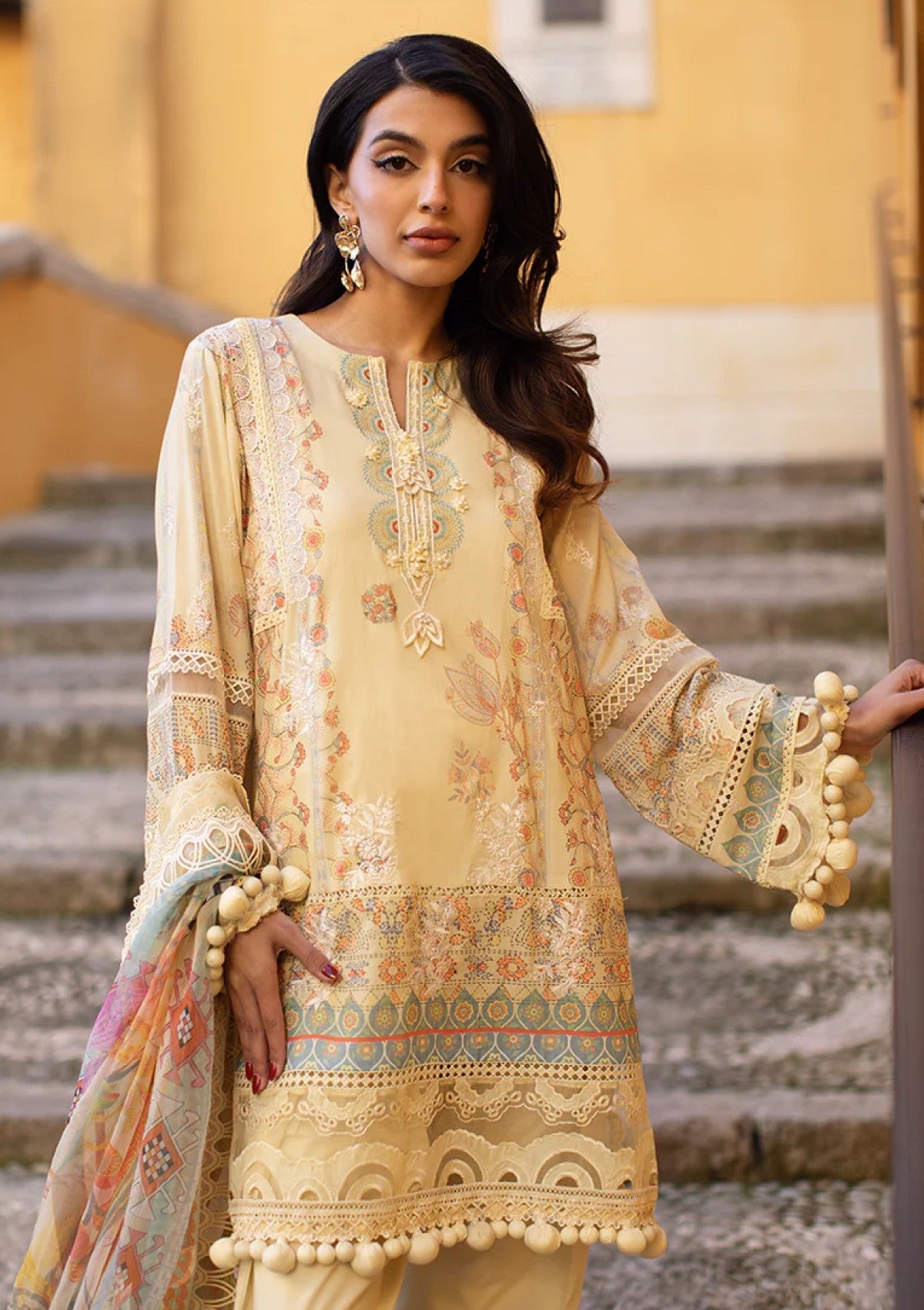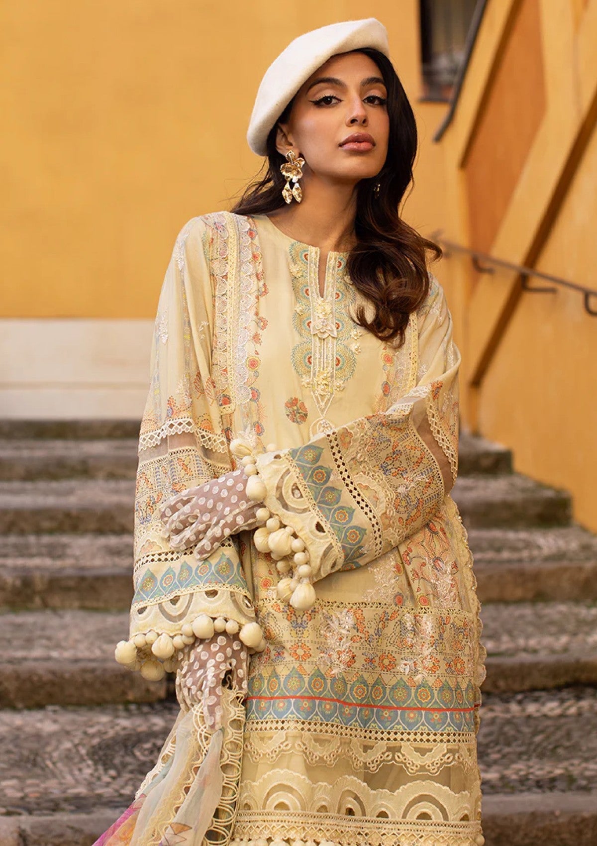 Introducing 'Mangosteen' a Kantha embroidery-inspired print complements the rich off-white embroidery, accented with appliquÃÂé borders in gorgeous shades of summer yellow. A bold dupatta layout adds a modern finesse.