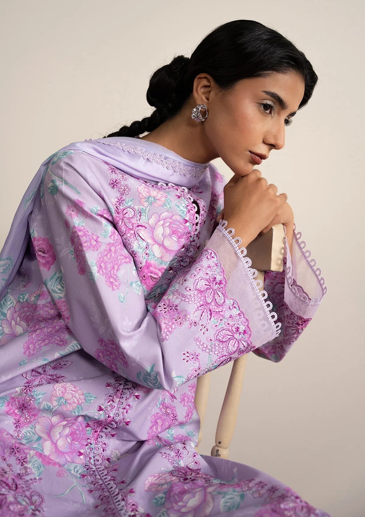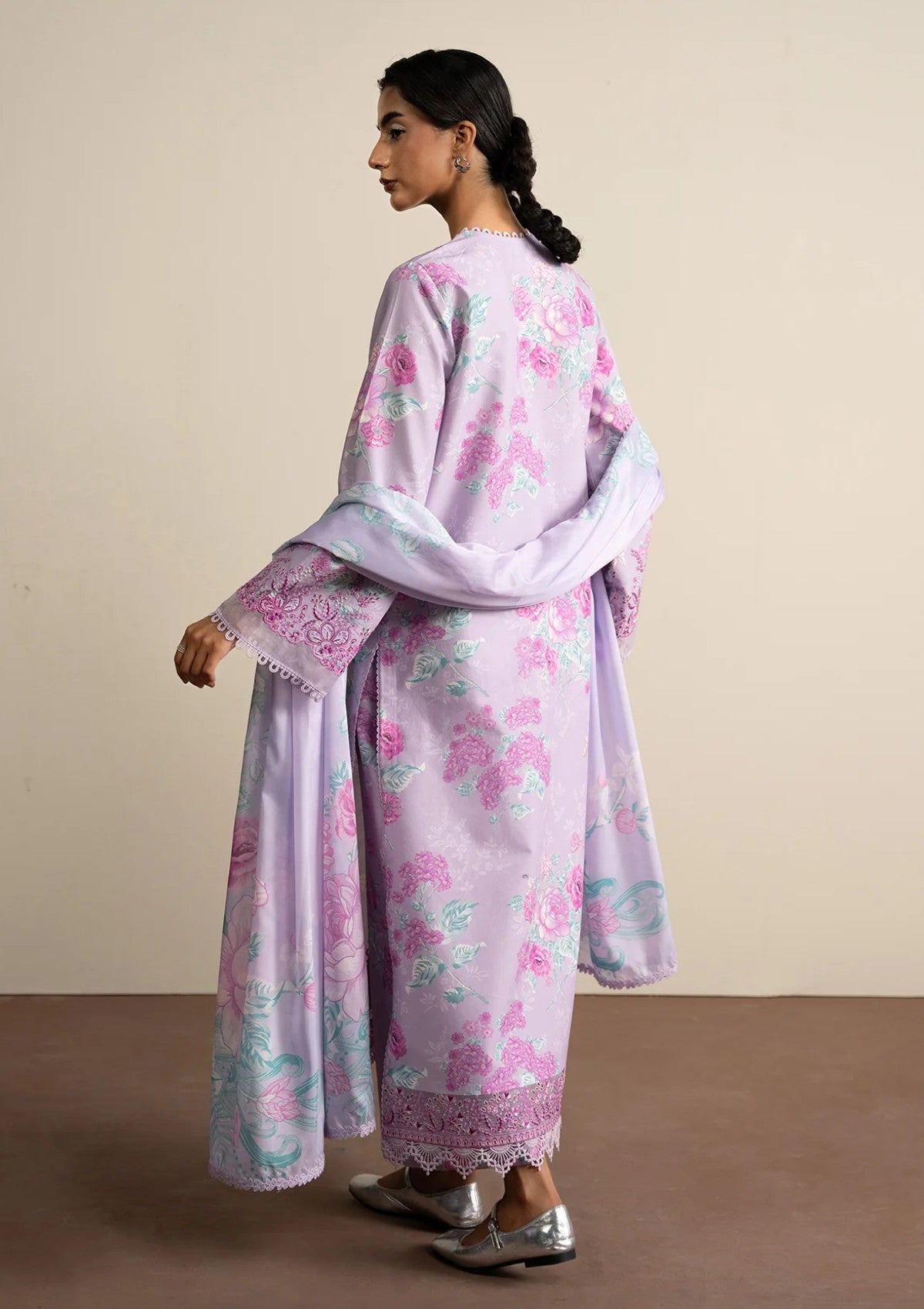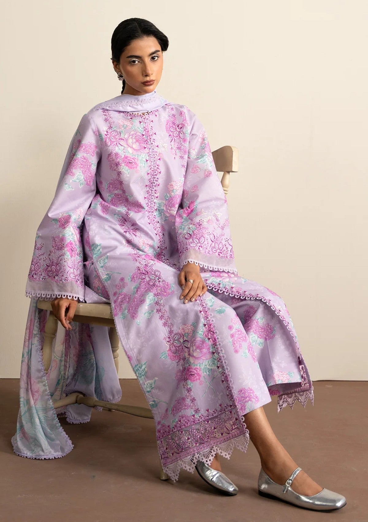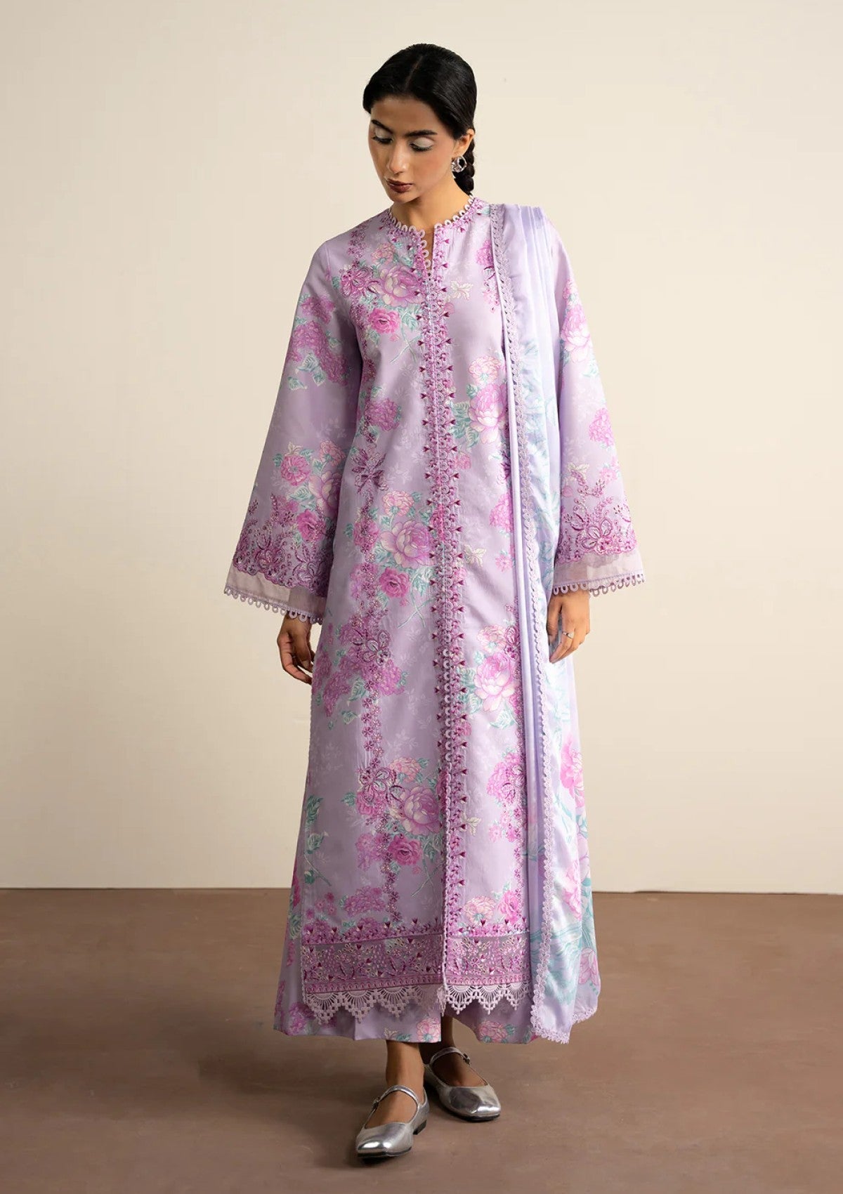 Delicate embroidery paired with intricate prints on a flowing dupatta creates a timeless blend of grace offering a refined and refreshing look.