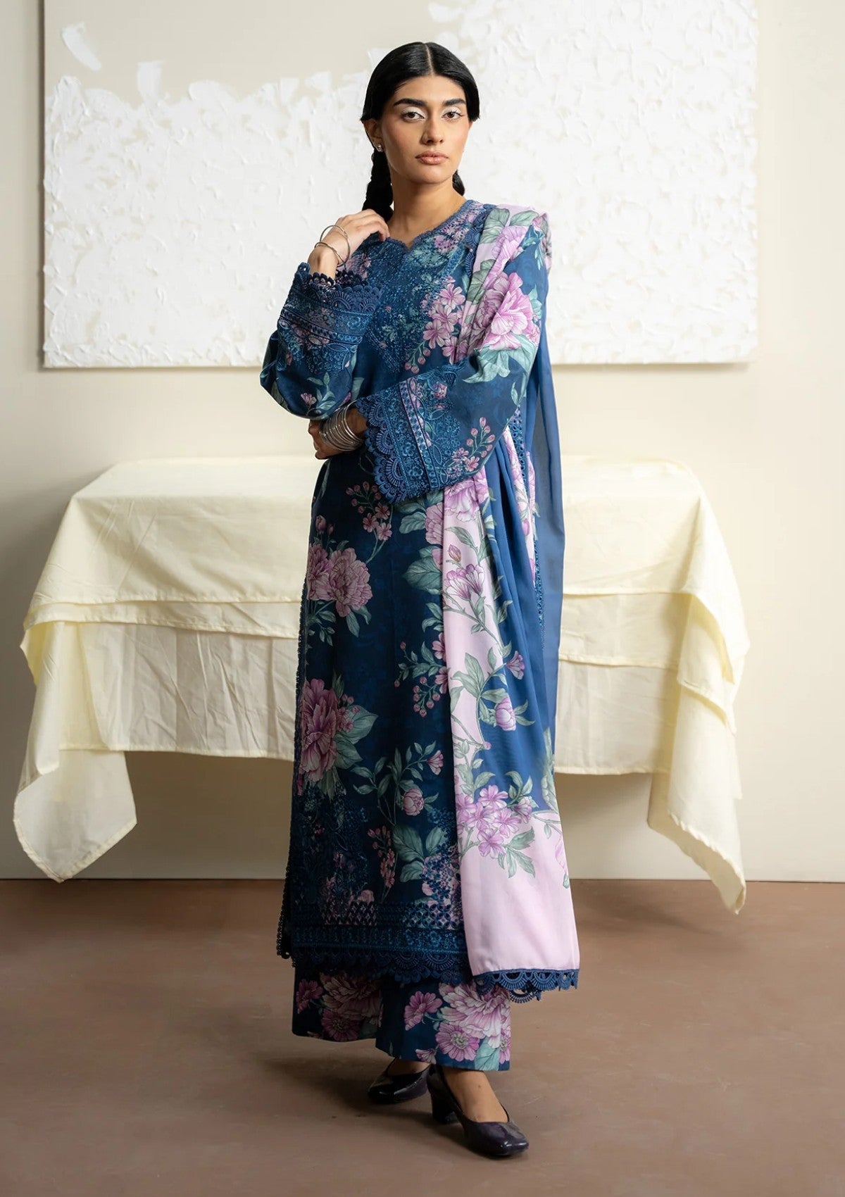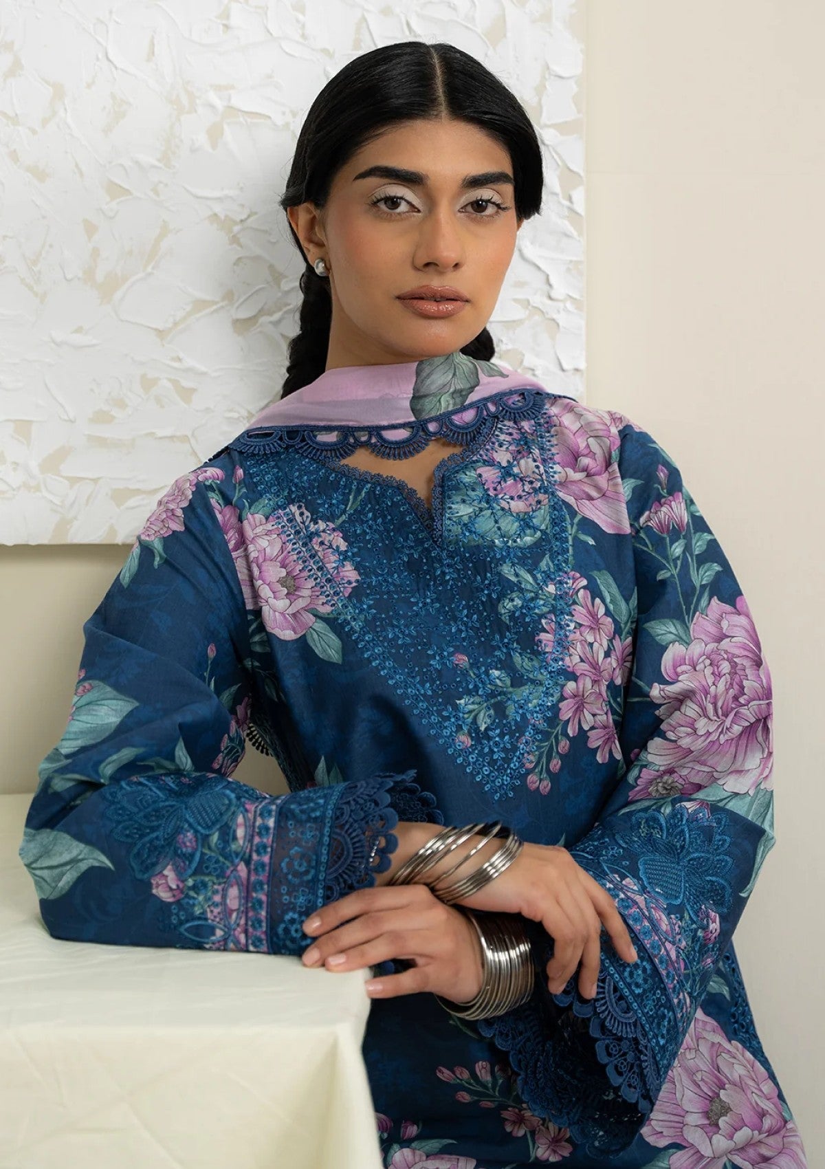 A vibrant floral print and a beautifully draped dupatta craft a summer ensemble that exudes freshness and sophistication.