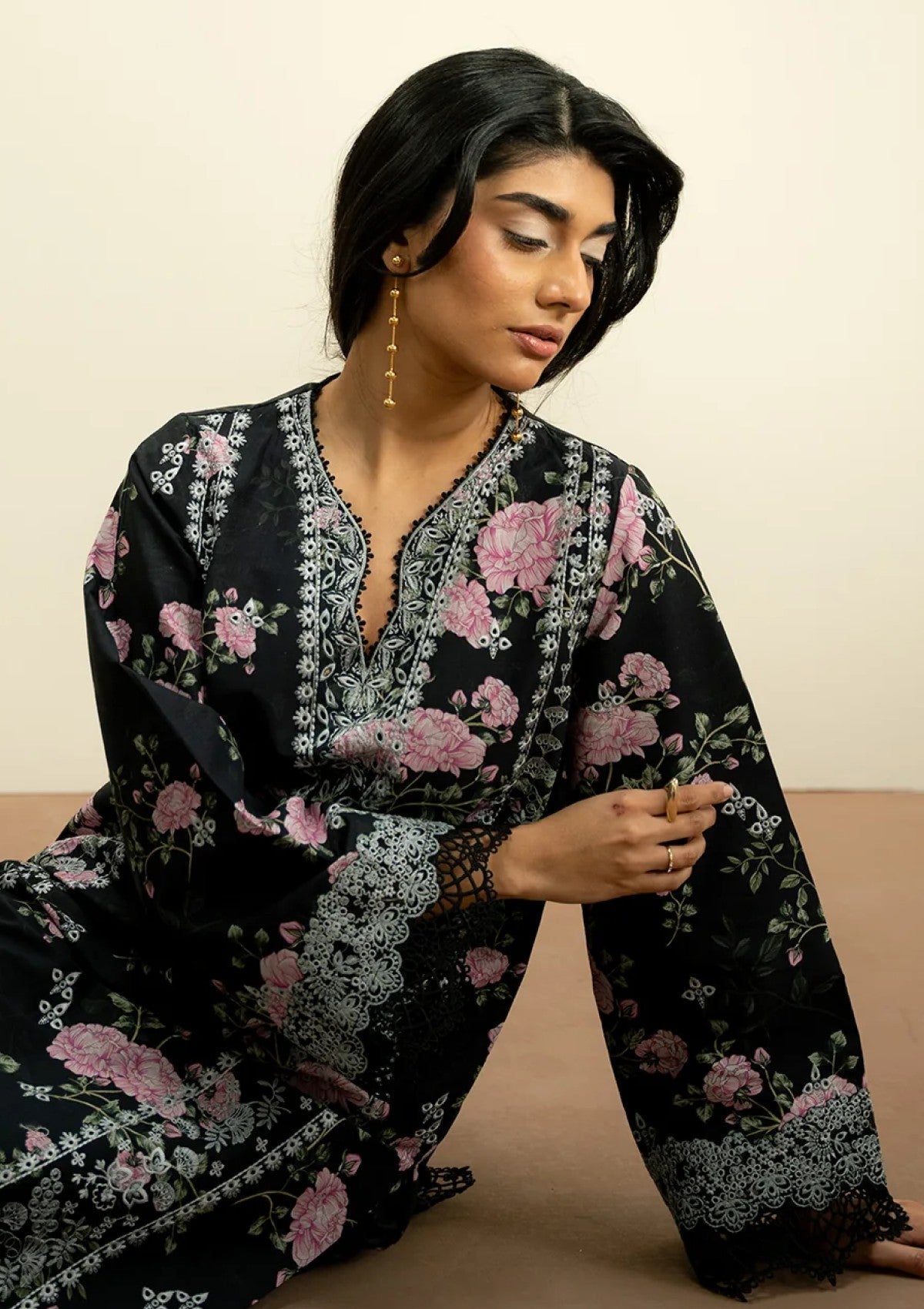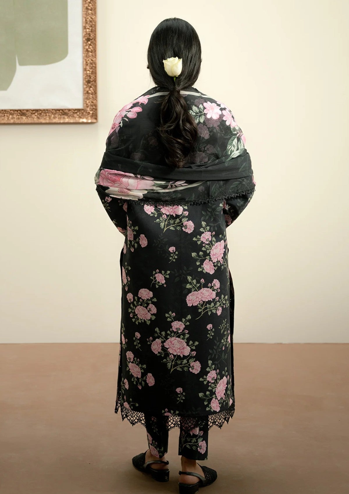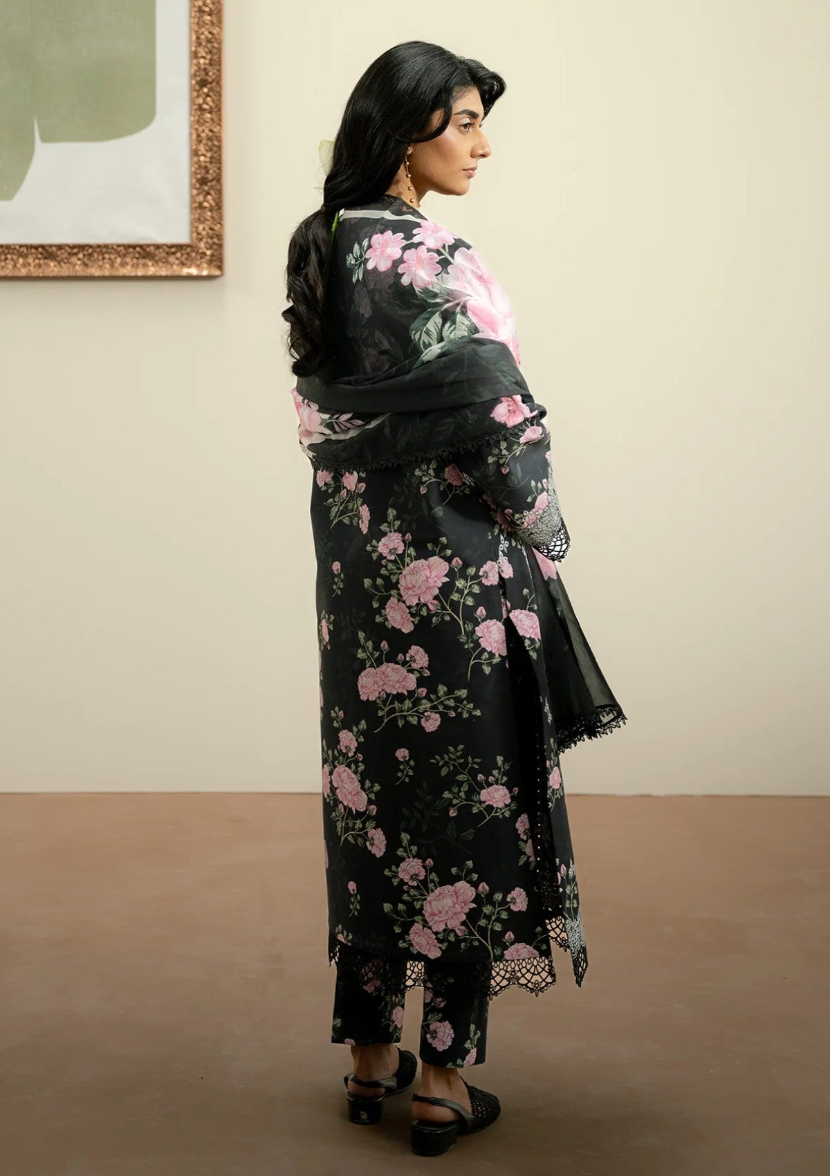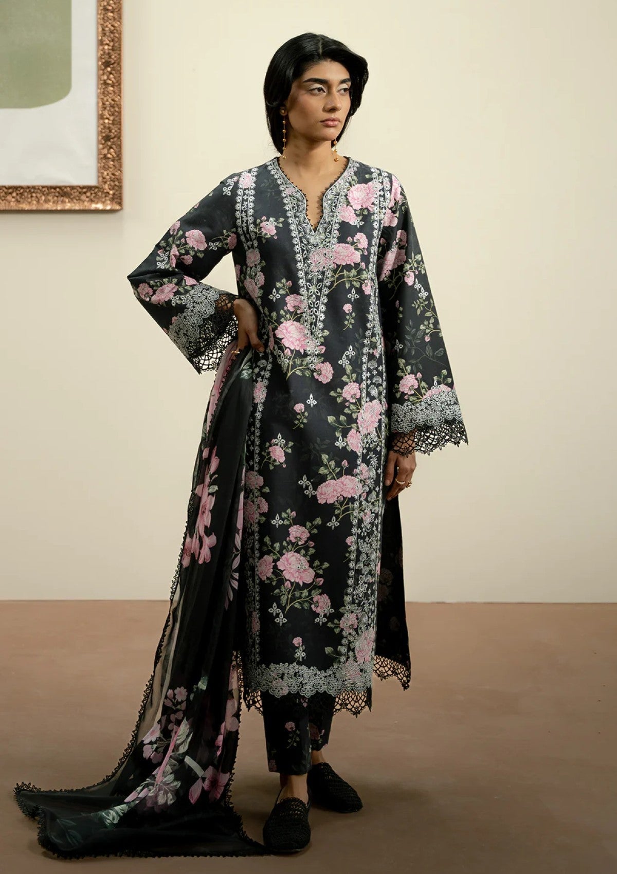 A seamless blend of rich black hues delicate detailing and a flowing dupatta, perfectly complemented by a tailored trouser.