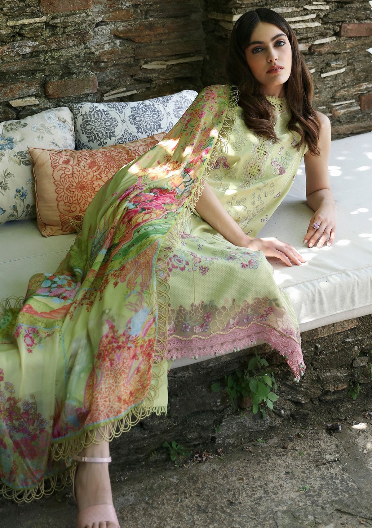 Lunara in apple green is a vision of summer freshness, with vibrant embroidered hues complemented by organza patches and a colorful silk dupatta. This ensemble makes a stylish statement with its lively color palette and detailed craftsmanship.