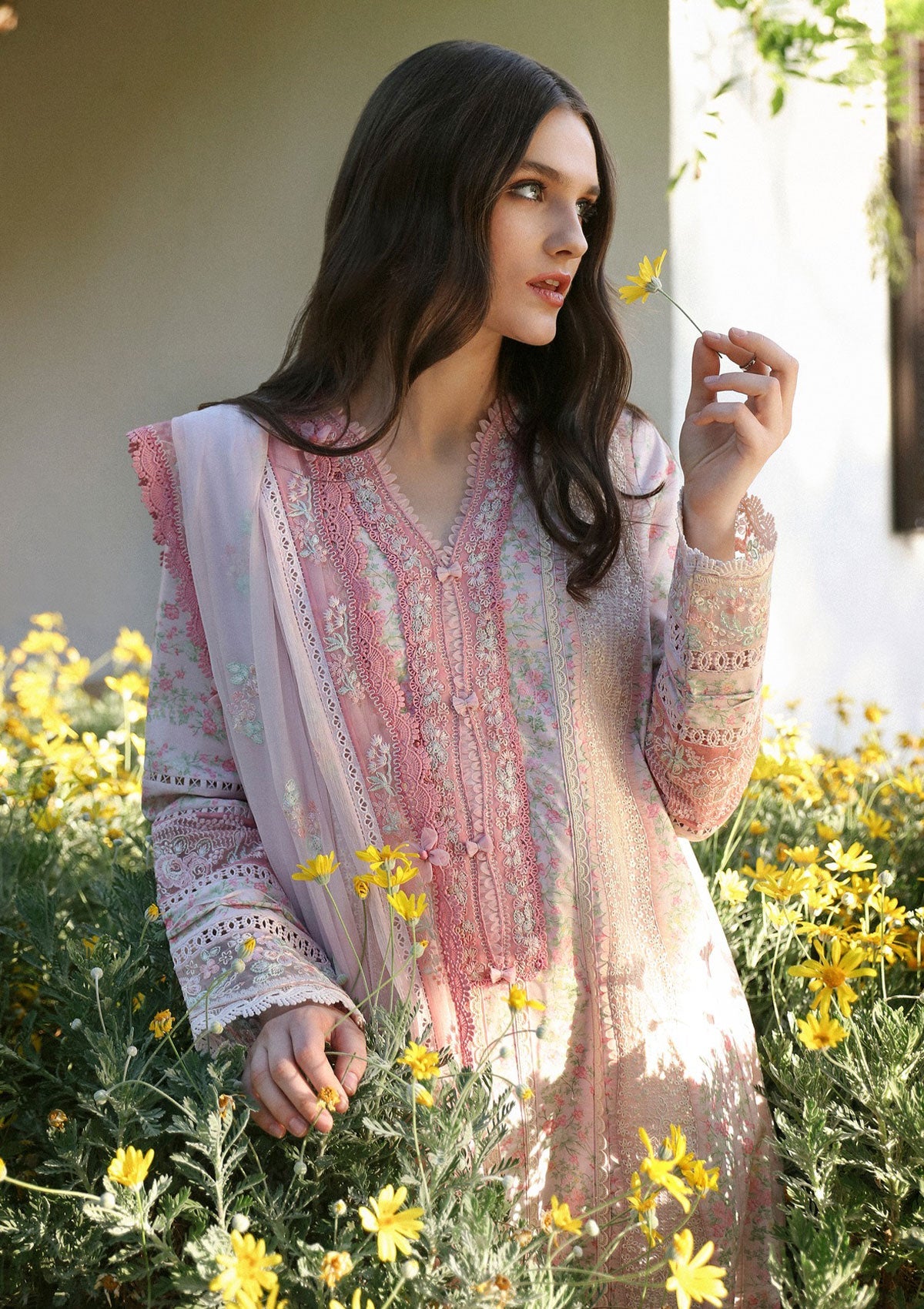 Rosa features a beautiful floral printed shirt in shades of pinks and greens, accented with white organza borders and a floral embroidered chiffon dupatta. This design exudes a delicate and refined elegance, perfect for any occasion.