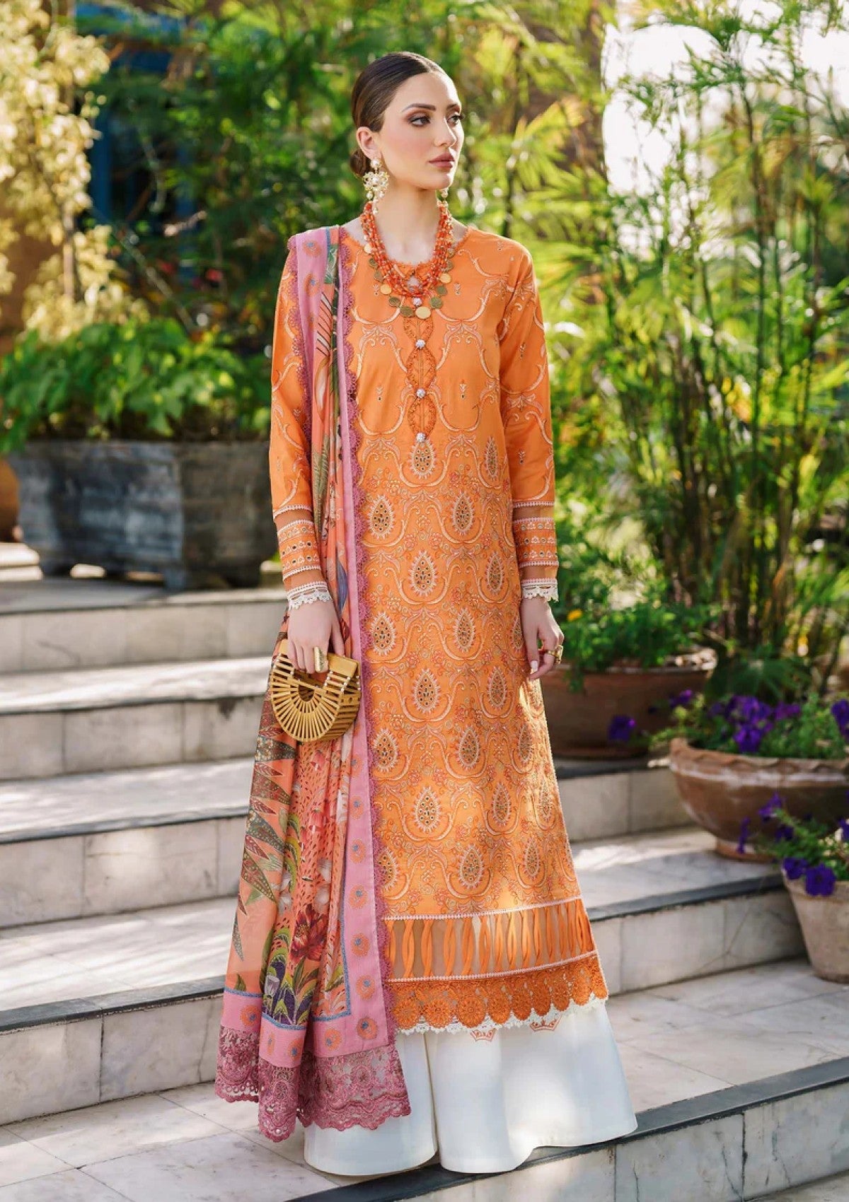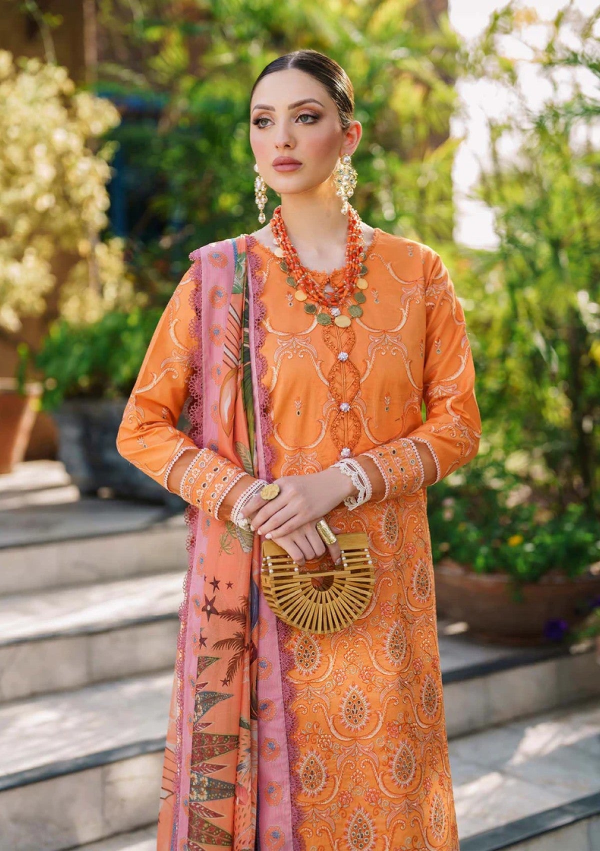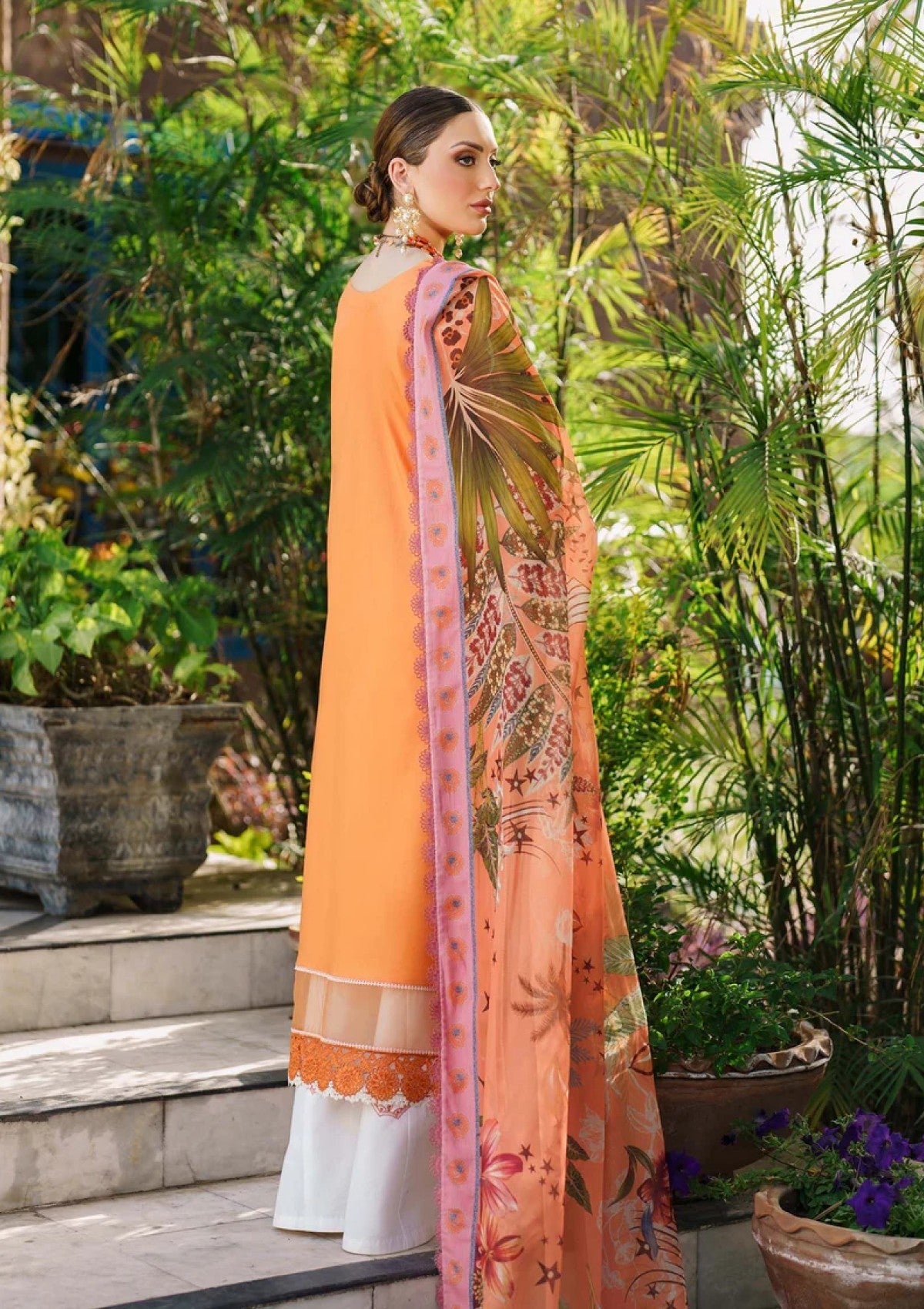 Make a style statement under the summer sun with âÃÂÃÂDawn'. Inspired by the tropics, this beautiful shade of orange adds freshness this season. The most stunning resham embroideries and schiffli thread work make this ensemble that more desirable. A matching printed silk dupatta perfectly compliments the look. Embroidered front on lawn - 1.27 metres Plain back on lawn - 1.27 metres Embroidered sleeves on lawn - 0.6 metres Embroidered lawn border for sleeve - 0.75 metres Cambric trouser - 3 metres Embroidered border for trouser - 1.85 metres Silk printed dupatta - 2.5 metres
