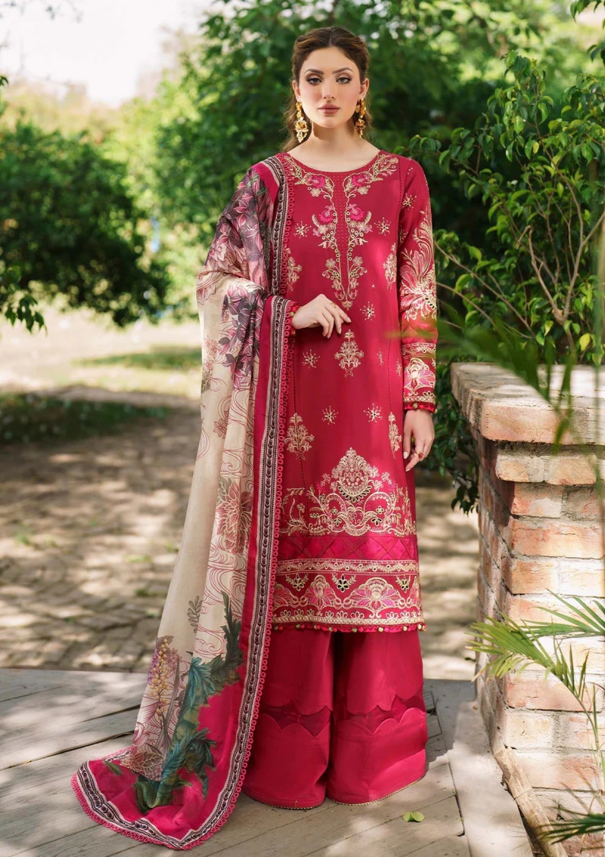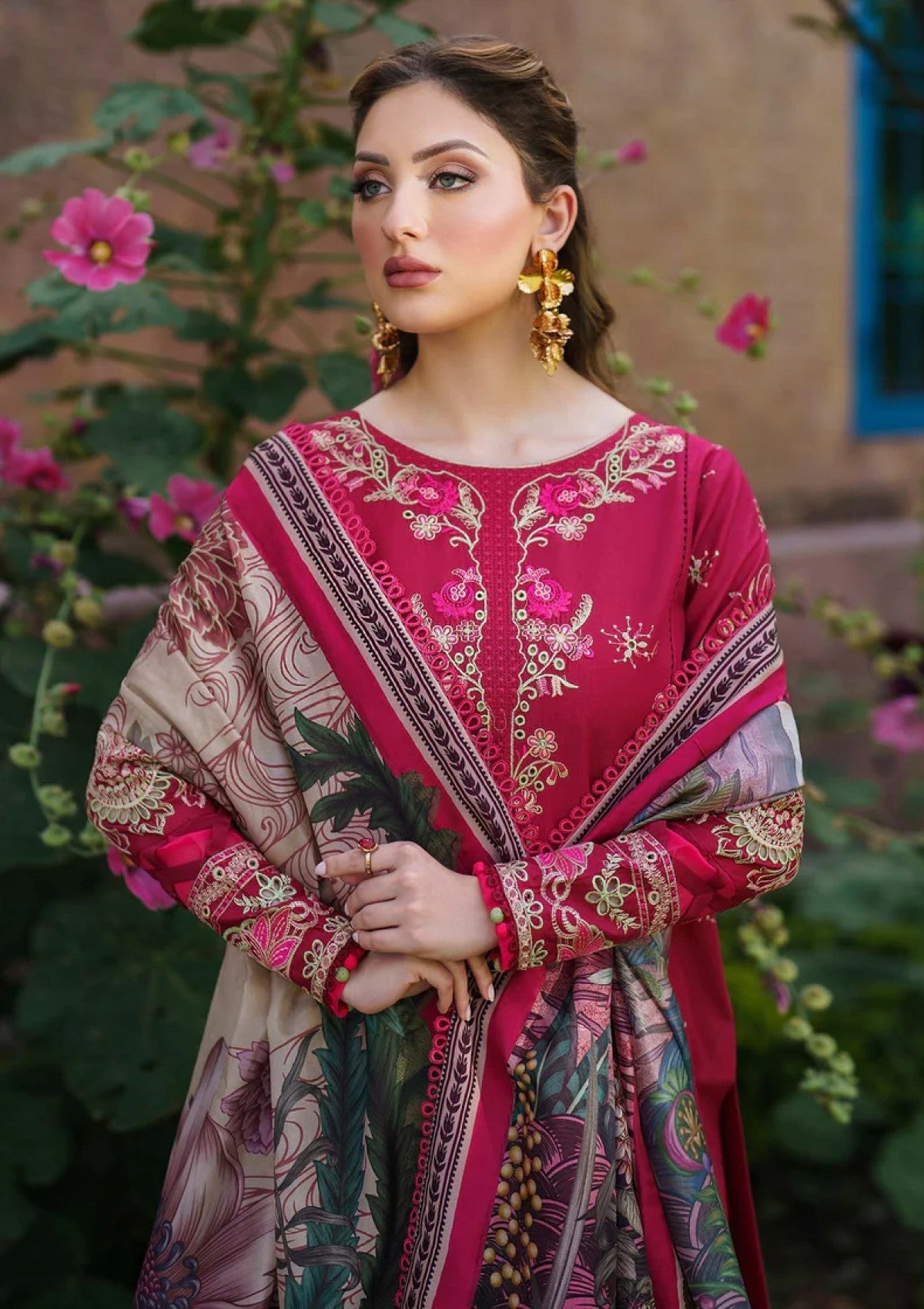 Setting the stage for supreme regal bliss is âÃÂÃÂGazelle', our one and only red ensemble of the season. This one of a kind shade of red has meticulously curated embroidery motifs all over with shades of peaches and pinks. A light and airy floral printed dupatta completes this stunning outfit. Embroidered centre panel on lawn - 1 Embroidered side panels on lawn - 2 Embroidered sleeves on lawn - 2 Embroidered border on lawn - 2.30 metres Plain lawn back - 1.27 metres Cambric trouser - 3 metres Silk printed dupatta - 2.5 metres