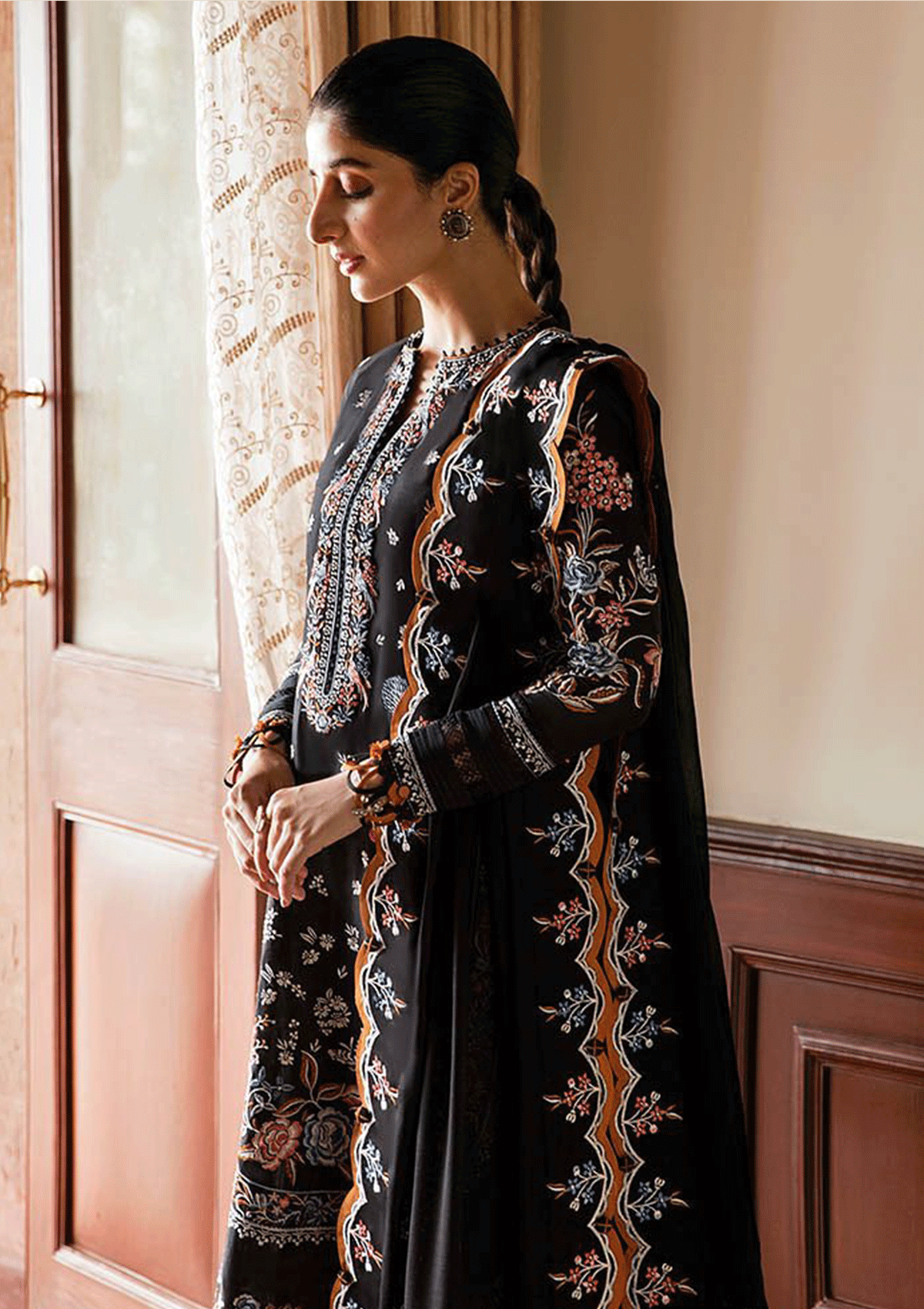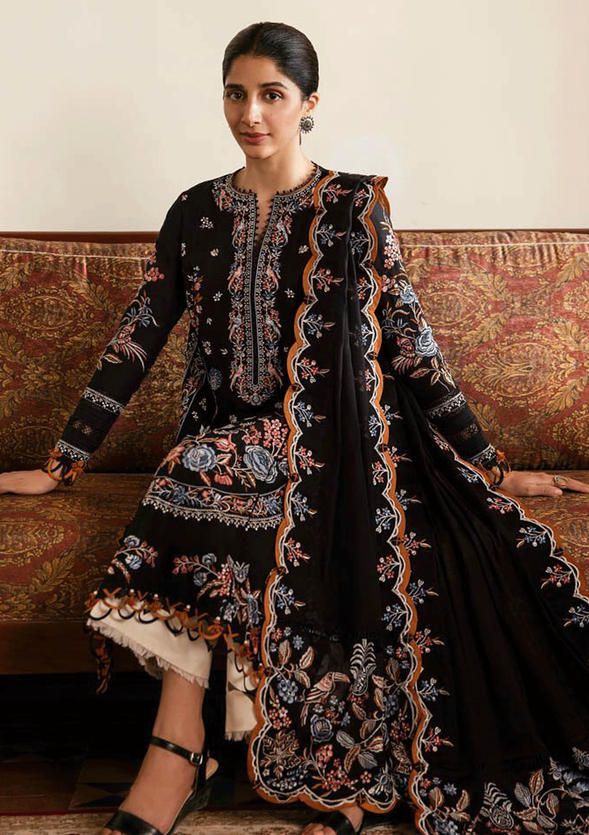 Description:'Irem' showcases an opulent tapestry, imbued with the enchantment of swirling ebony hue, delicately interwoven with resplendent threads of myriad shades. Adorned with resplendent accents of sapphire, amber, coral, and pearl, the fabric blooms into an exquisitely embroidered garden of untamed flora, each petal a testament to artistry. Akin to a masterpiece, the ensemble is accompanied by an exquisitely crafted dupatta, its edges kissed by scalloped borders that lovingly frame the intricate blooms. This ensemble transcends time, poised to become an iconic embodiment of elegance and grace.
