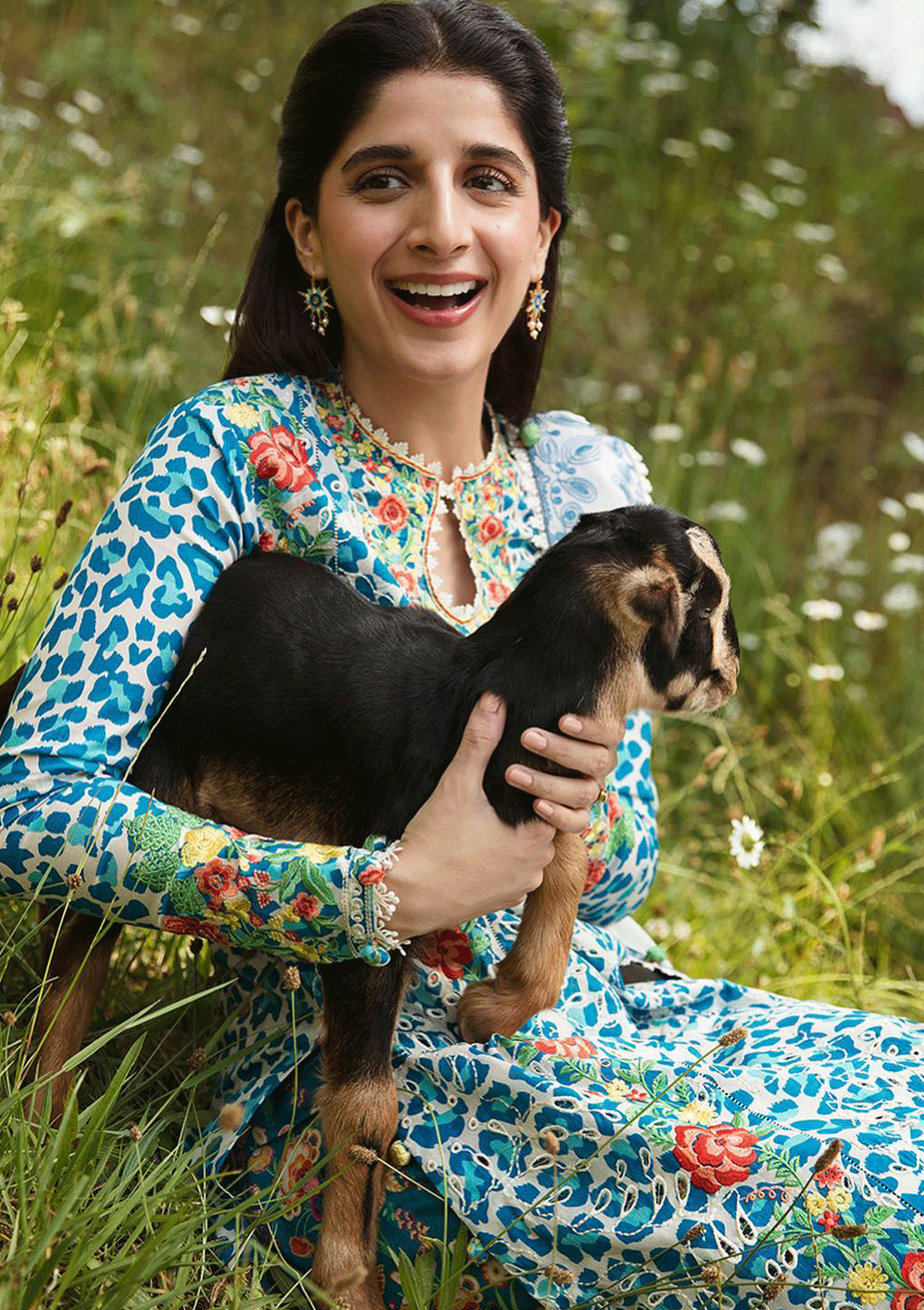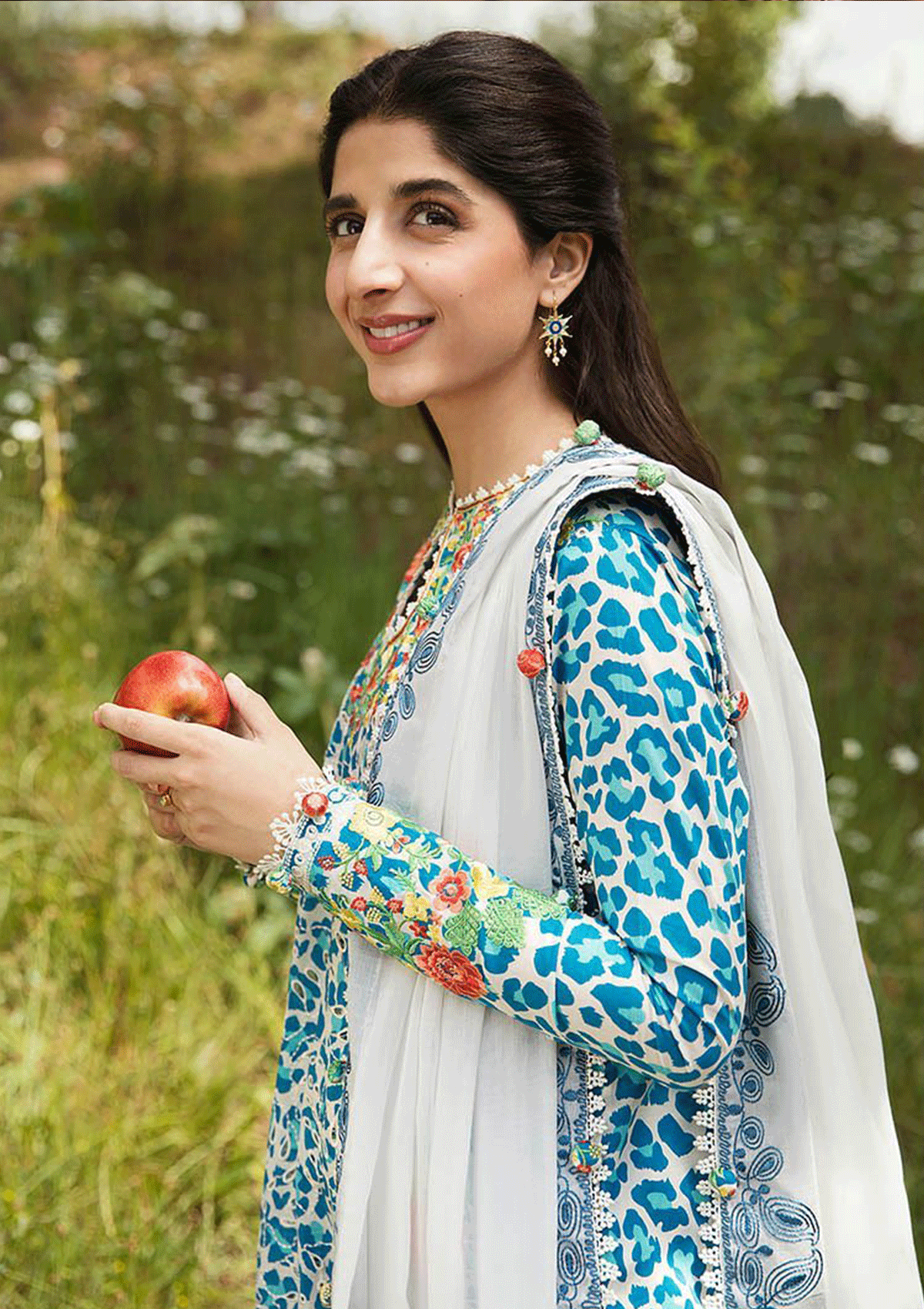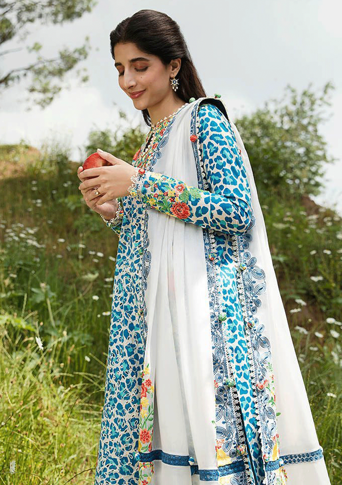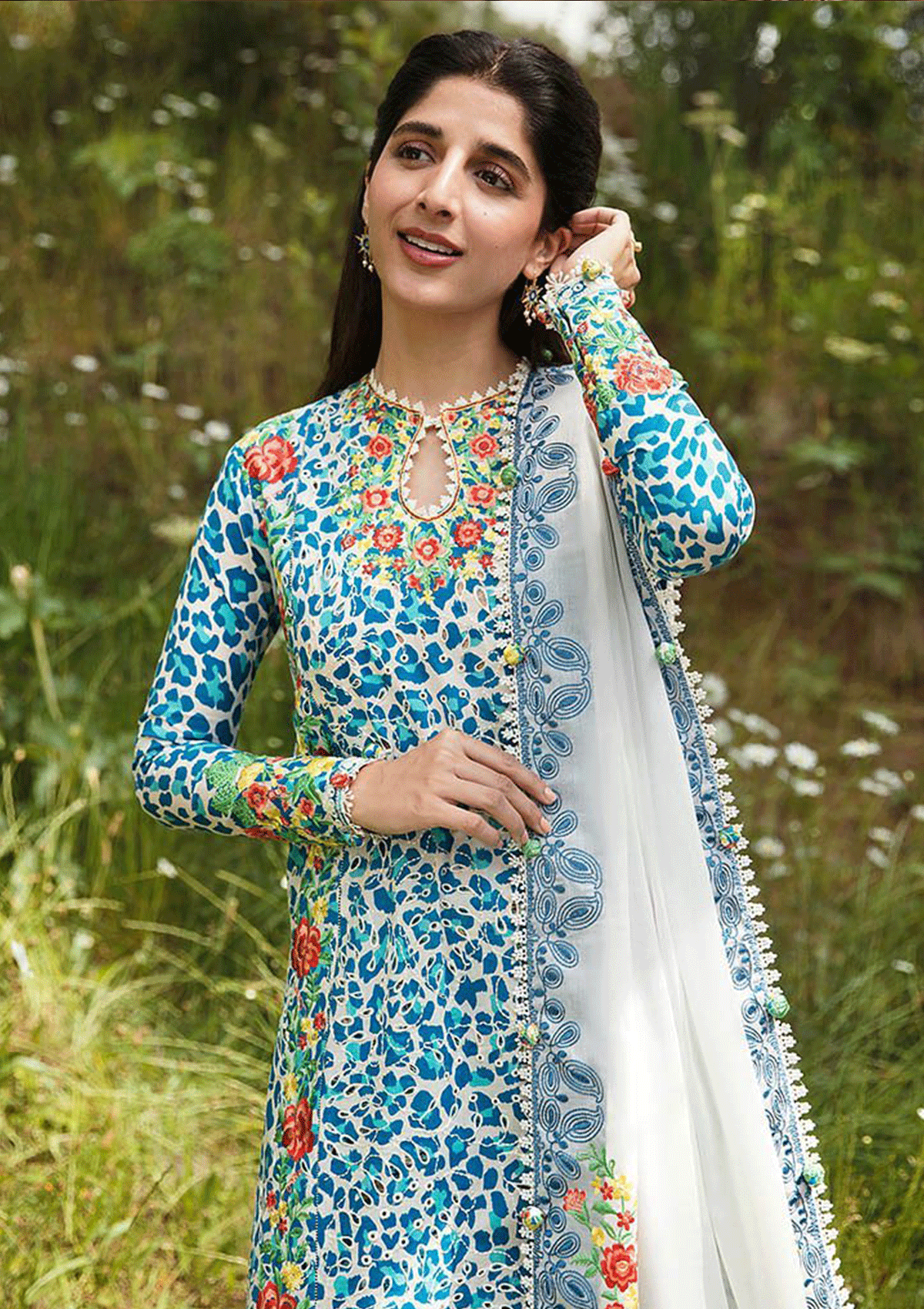 Description:Where untamed grace meets a kaleidoscope of hues, behold the captivating allure of âÃÂÃÂSelin'. Curating a mesmerising composition, the blue and white cheetah print with tinged of cyan dances across the shirt, enhanced with delicate schiffli patterns. Embroidered floral festoons, resplendent in scarlet, yellow, green whisper secrets of nature's vibrant tapestry. Embrace the whimsical charm as printed trousers reveal a realm of colorful sea creatures, frolicking amidst waves of imagination. The ethereal white dupatta, adorned with embroidered borders and pallid, unveils a botanical dreamscape, where bright blossoms bloom with enchanting hues. Experience the poetry of fashion, where every thread weaves a tale of beauty."
