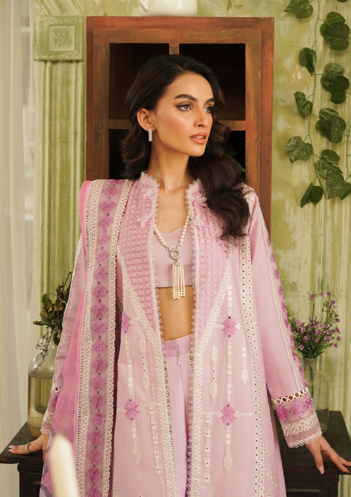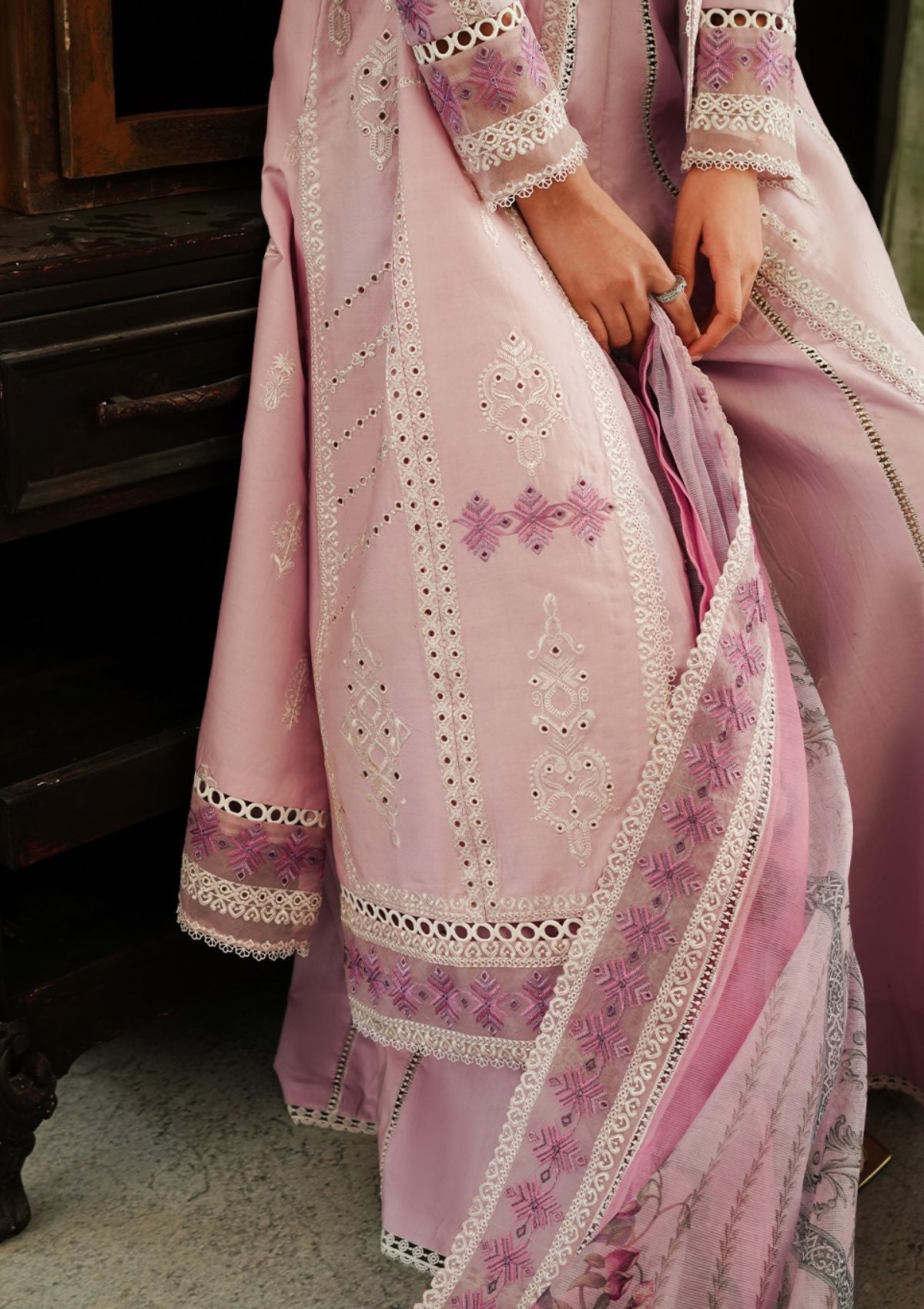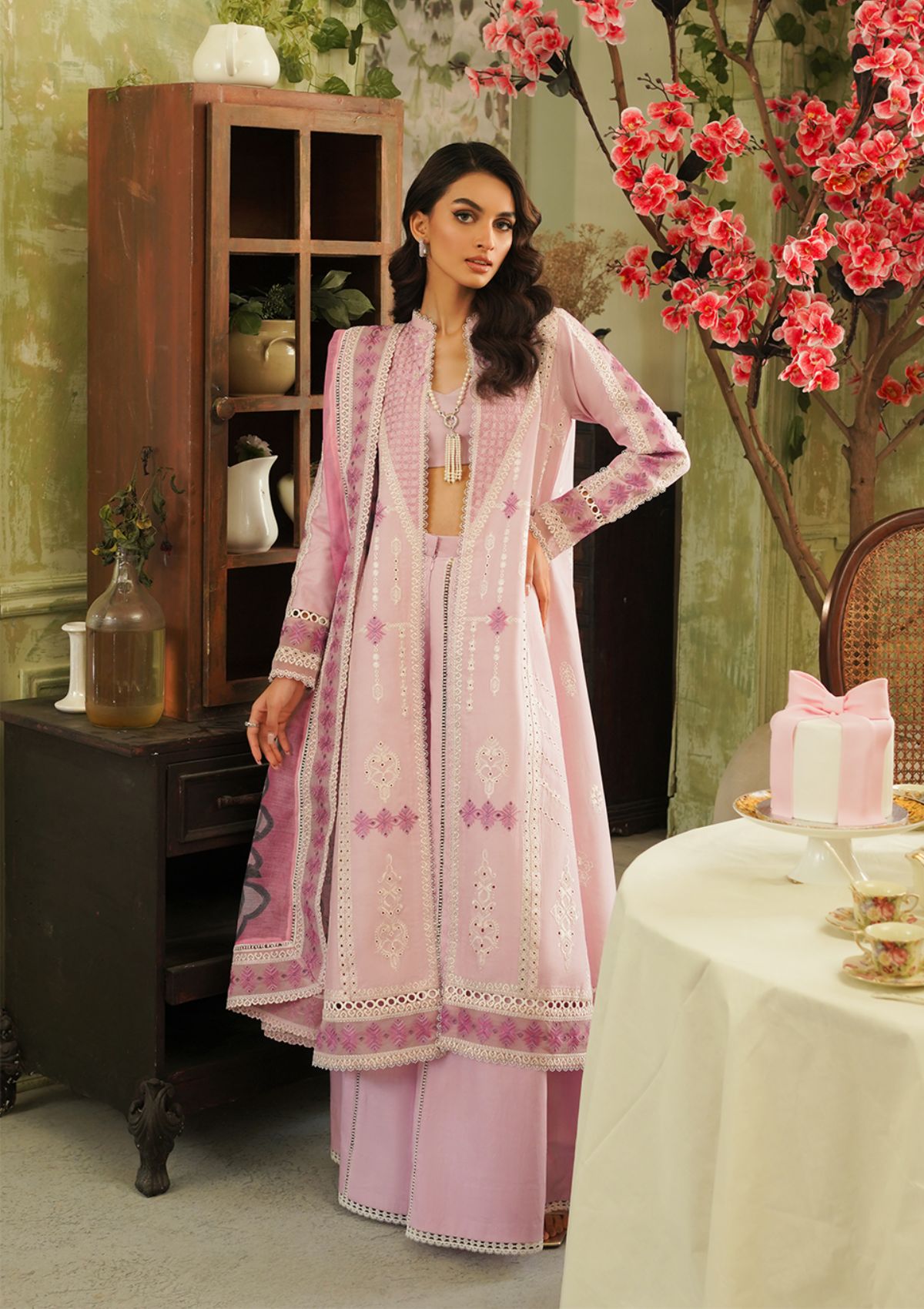 Presented in a captivating shade of periwinkle, âÃÂÃÂFaye' unveils delicate embroideries in subtle variations, crafted with precision threadwork enhanced by ivory silver accents. It is a gracefully open-front design adorned with intricate phulkari embroidery, glowing in the luminous hue of lilac and ivory. Each stitch tells a story of unparalleled elegance and sophistication. The shirt is further enhanced by an array of intricately embroidered borders in contrasting colors, adding depth and definition to the design. Paired with a stunning signature digital print dupatta featuring bold abstract art in vibrant hues, framed with intricate embroidered borders. Faye' transcends traditional summer lawn aesthetics, offering a statement ensemble that exudes unparalleled style and sophistication.