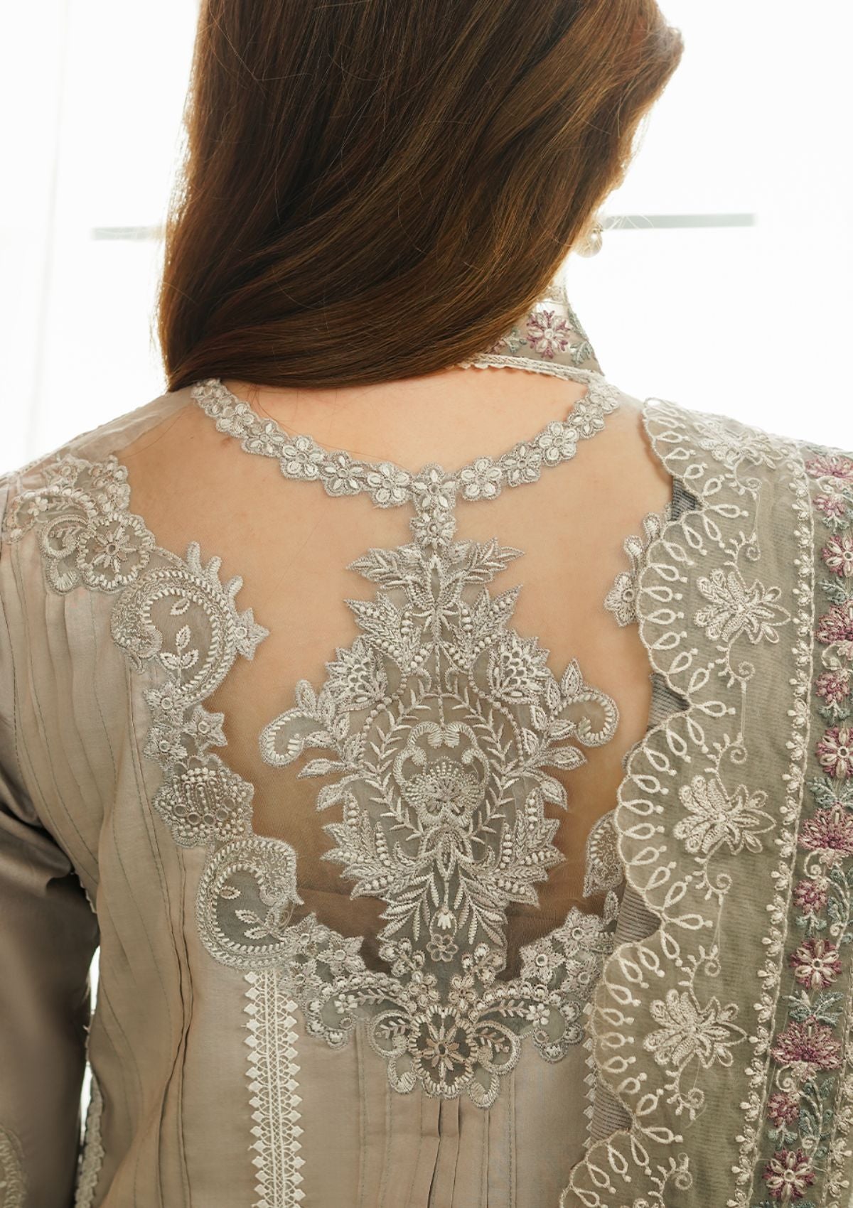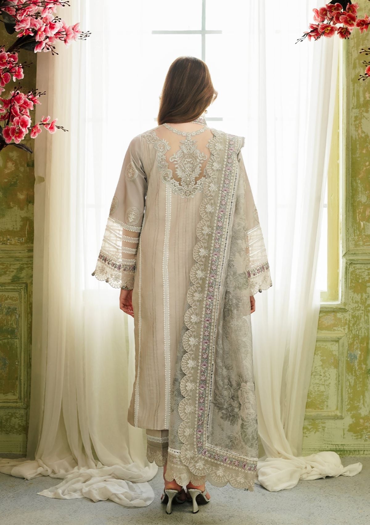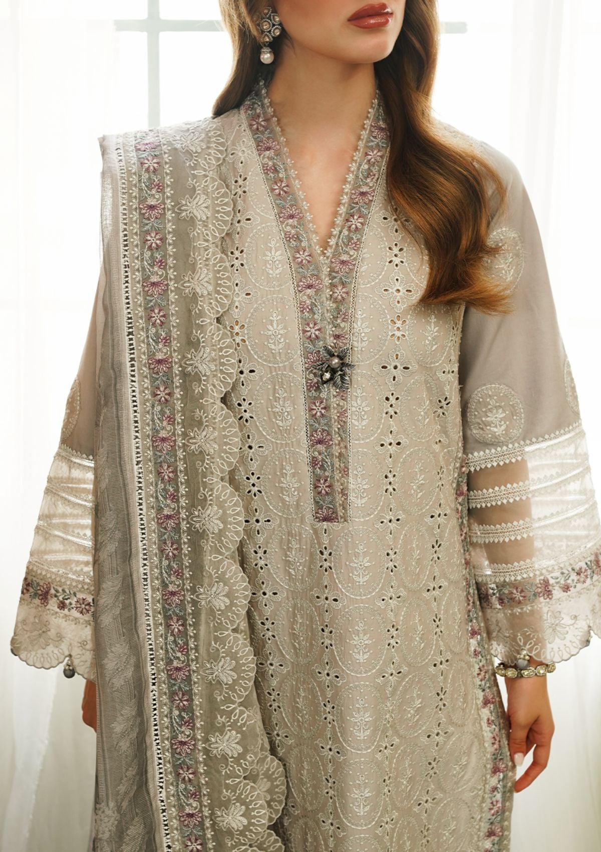 A vision of timeless elegance crafted on dove gray canvas , adorned with exquisite embroideries in shades of ivory, pink, sage, teal and grays. This ensemble epitomizes sophistication, with intricate schiffli detailing embroidery and a harmonious color palette that exudes refinement. Paired with a tonal digital printed dupatta boasting delicate embroidered accents. A true masterpiece of timeless allure, it beckons admiration as a coveted addition to any discerning collectors ensemble.