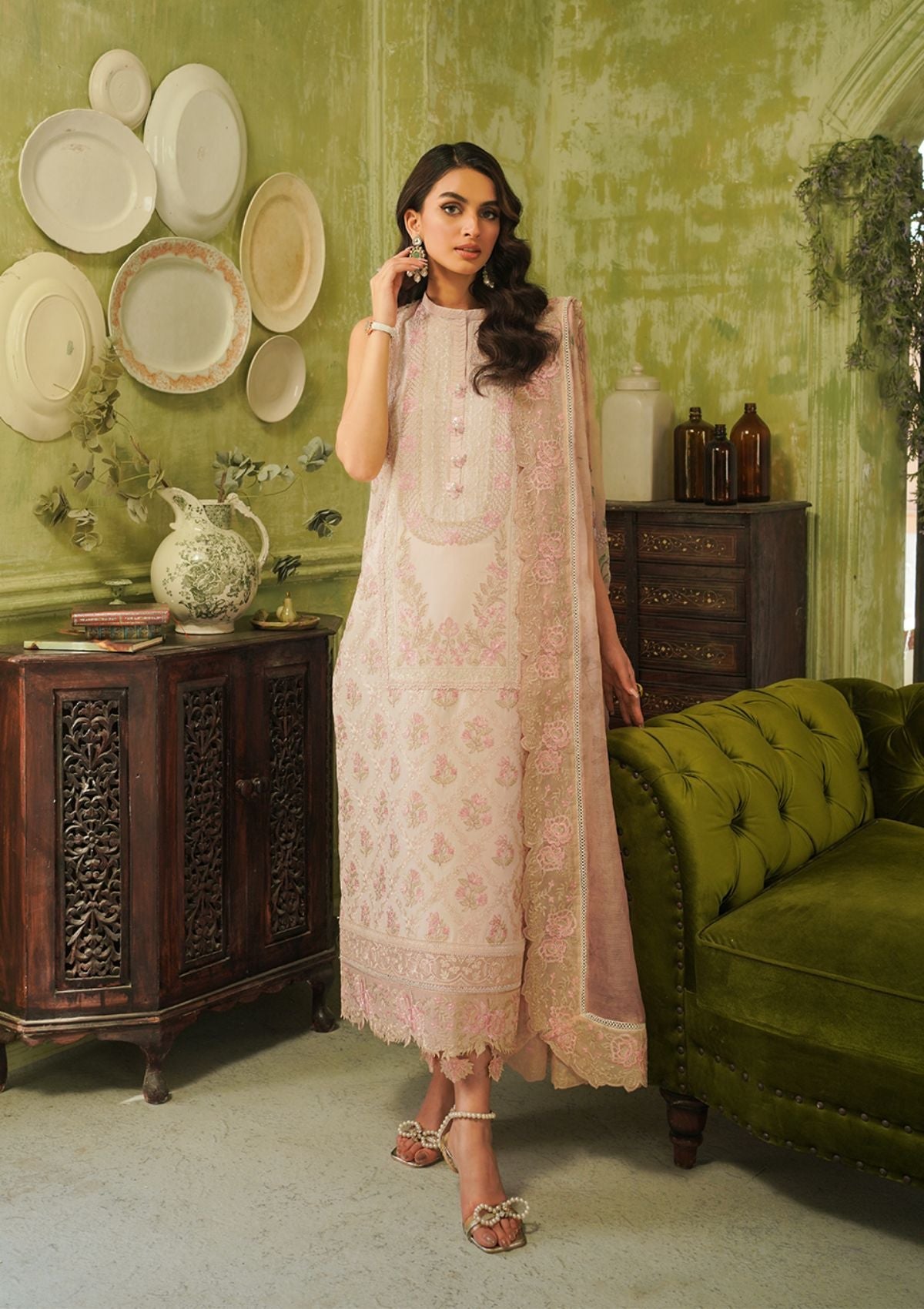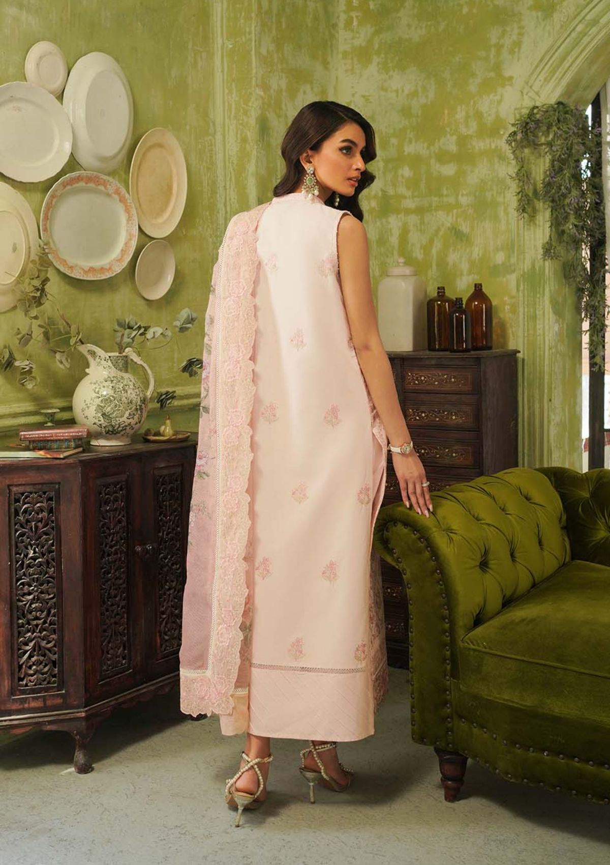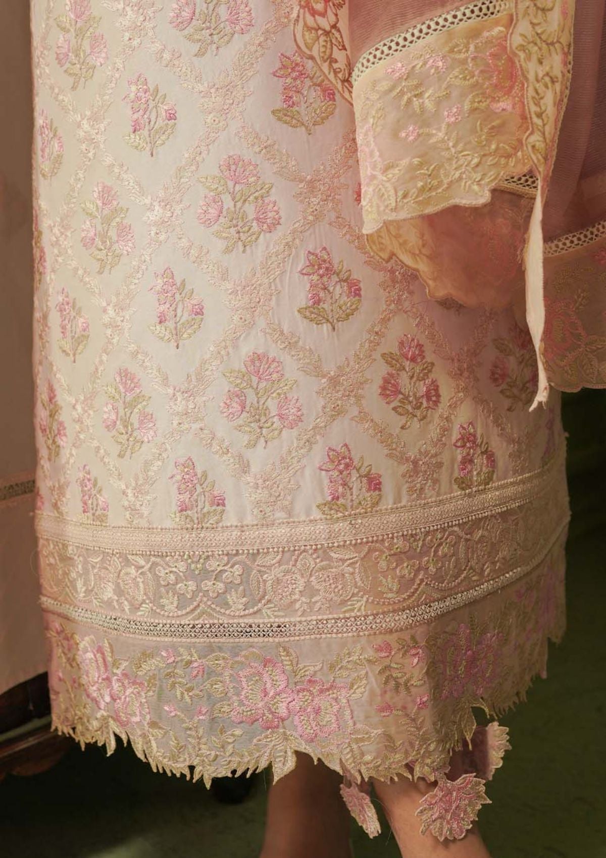 A serene soft peach color canvas is adorned with breathtaking embroidery in shades of rose pink, ivory and sage. The delicate blooms and intricate patterns create a captivating tapestry, exuding elegance and sophistication. The celestial peach backdrop provides a serene contrast, allowing the embroidery to shine with its subtle yet mesmerizing hues. Paired with a matching digital printed dupatta framed with detailed floral embroidered border, this ensemble is perfect for those seeking to understand beauty with a touch of celestial charm.