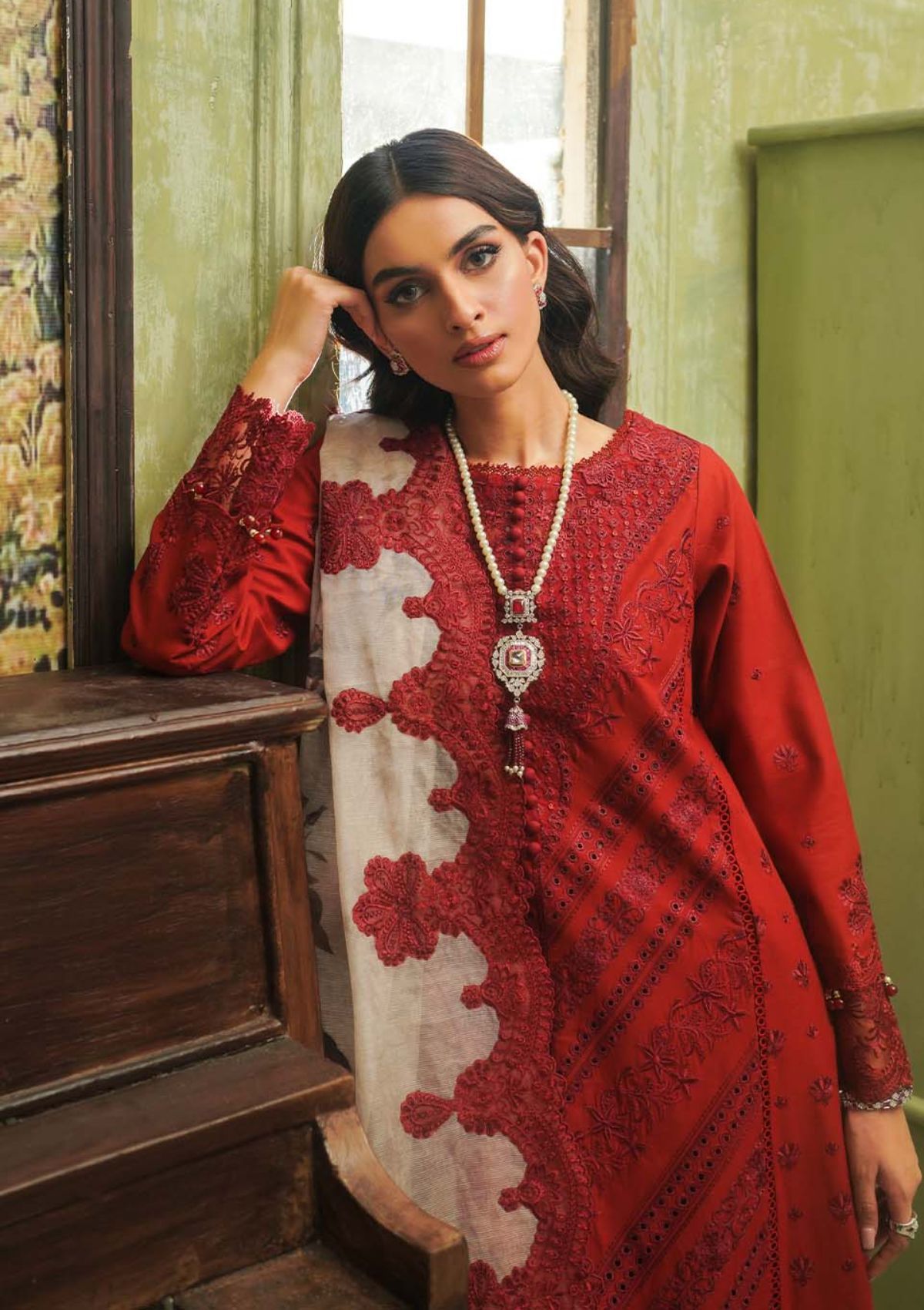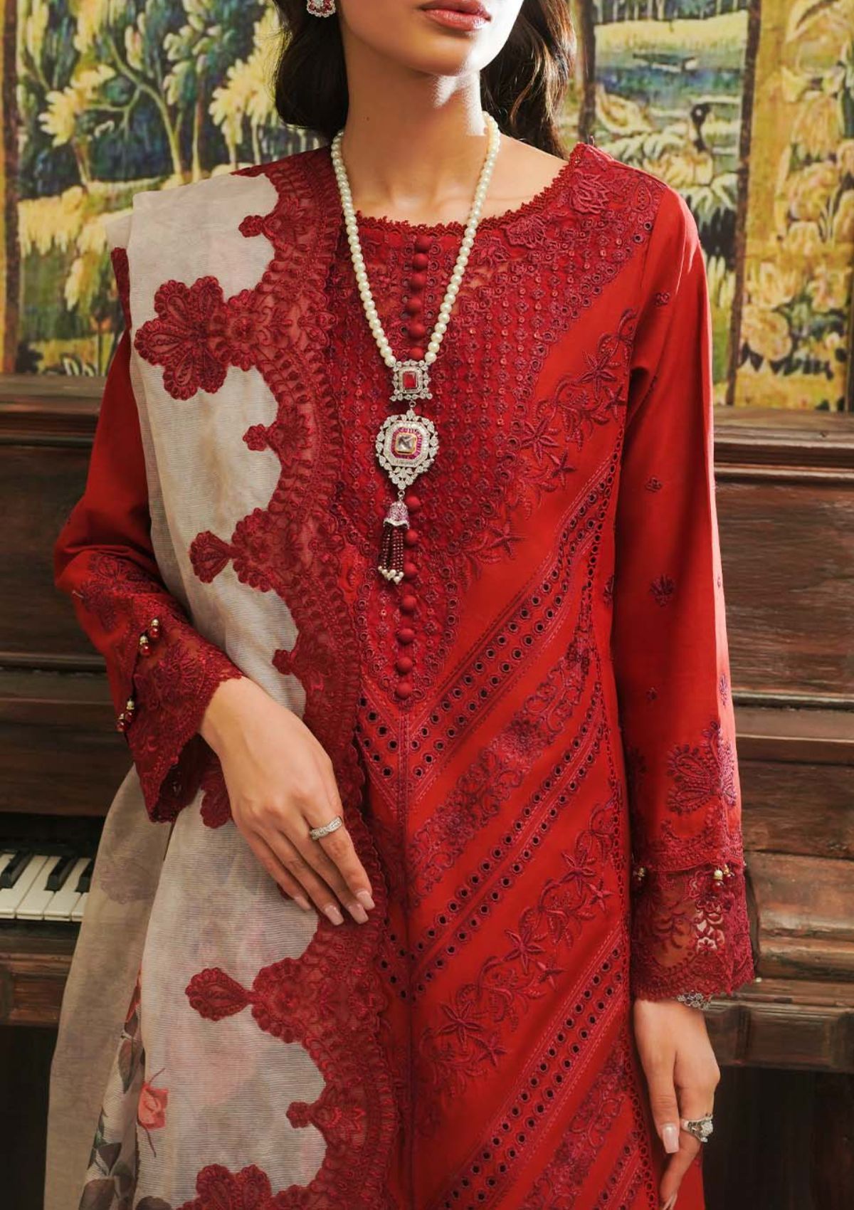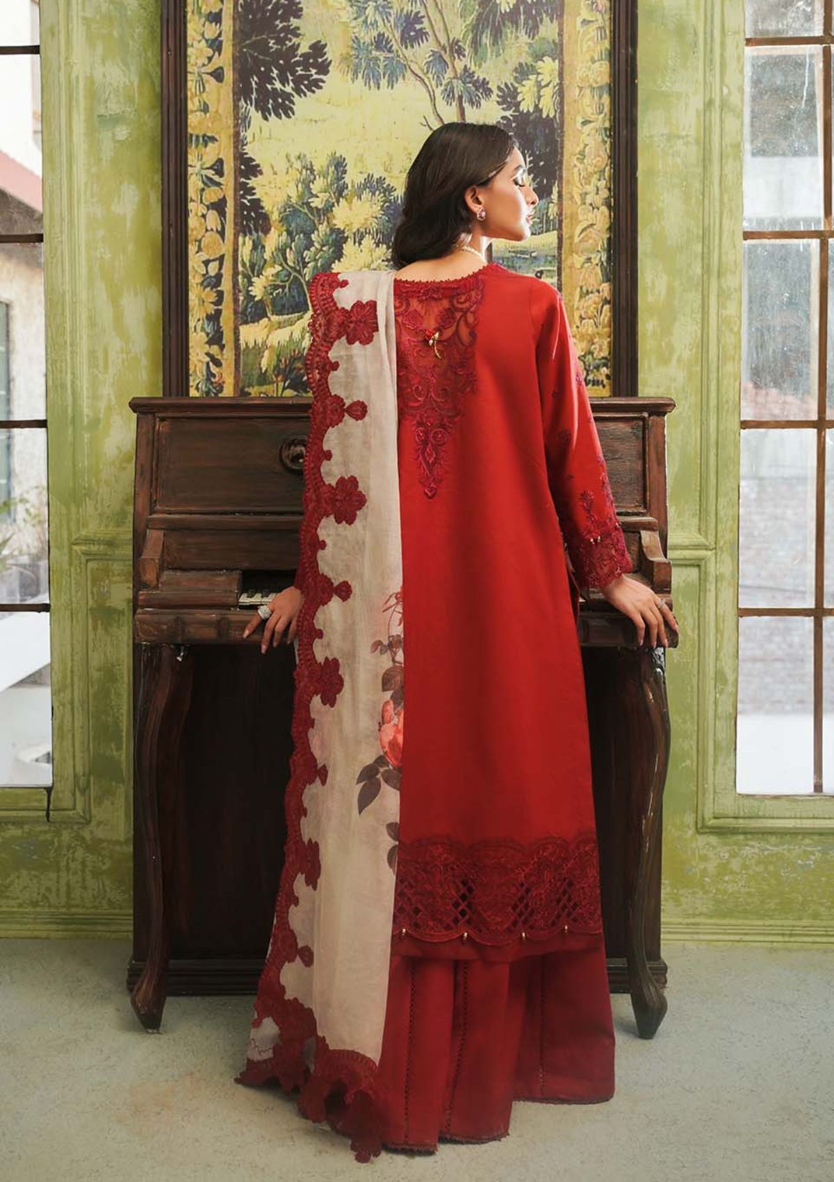 Introducing âÃÂÃÂRosaline,âÃÂàpresented in a scarlet red hue that radiates serenity and elegance. Delicate embroideries, rendered in silk threads of rogue scarlet and maroon adorn the fabric with intricate motifs inspired by the beauty of nature. The shirt's borders exhibit meticulous craftsmanship, while the contrasting digital print dupatta features embroidered details reminiscent of swirling garden blossoms. âÃÂÃÂRosalineâÃÂàoffers wearers the opportunity to embody elegance and sophistication in every step, making it a perfect choice for those seeking understated yet refined sartorial expressions.