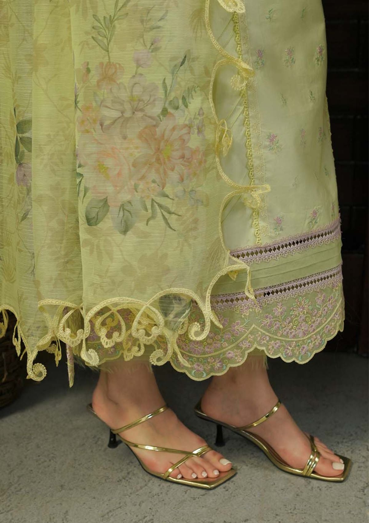 Immerse yourself in the enchanting world of âÃÂÃÂPrimrose'; Where a heavenly pale yellow sets the stage for a mesmerizing transformation. Prepare to be captivated by the delicate embroidery that intricately weaves florals and dainty folioles, creating a tapestry of ethereal beauty. Luxurious schiffli lace accents elevate this masterpiece. As your gaze wanders, a luscious digital printed embroidered dupatta unfolds showcasing an artistry of blooming flowers and cutwork on all four sides, âÃÂÃÂPrimrose' exudes easy understated glamor, making it the perfect choice for summer soirÃÂées.