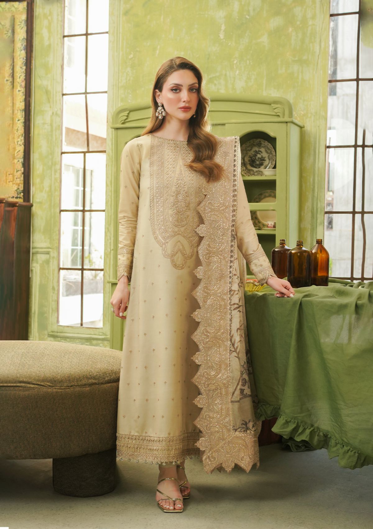 Rendered in opulent fawn âÃÂÃÂAlisa' showcases exquisite tone-on-tone embroideries employing intricate threadwork accented with silver tinsels. The scalloped neckline and ethereal tribal motifs cascading over the diaphanous lawn canvas imbue a sense of feminine elegance into this sophisticated ensemble, Paired with an exquisite printed Khaadi net dupatta adorned with a blossoming embroidery, this ensemble is a true ode to femininity and romance. A collector's reverie, it exudes a regal, timeless, and luxurious allure, inviting one to bask in its floral embrace.