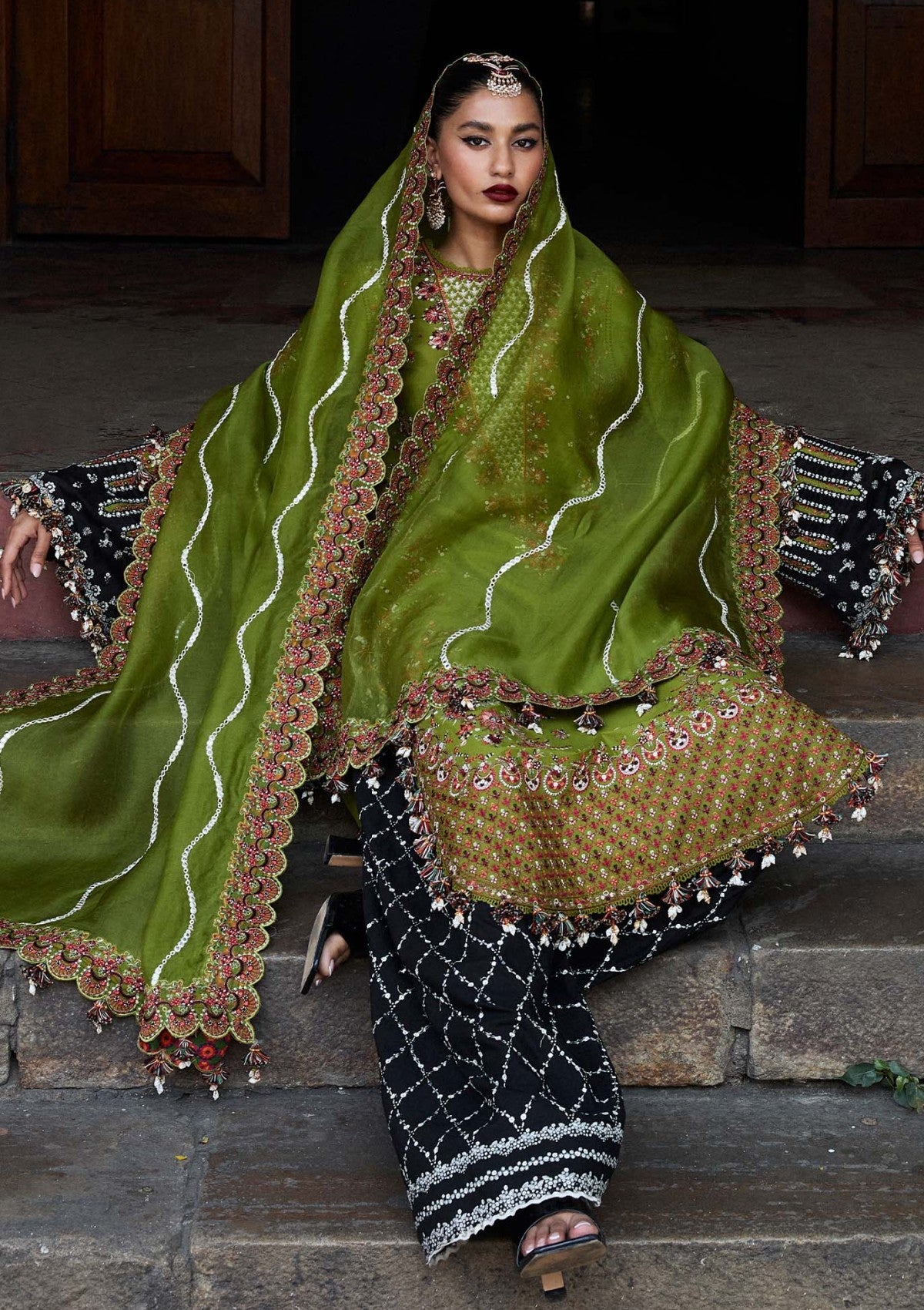 A beautiful olive green lawn shirt serves as the base of the outfit. The shirt is heavily adorned with white and monotone embroidery on the front and sleeves, adding a touch of elegance. A black dyed shalwar with an embroidered border complements the shirt perfectly. A stunning olive green organza dupatta with embroidery adds a pop of color and completes the outfit. The heavy embroidery on the shirt and shalwar adds a level of sophistication and intricacy.