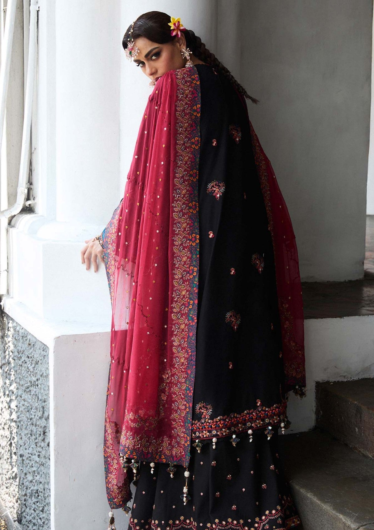 Embrace the elegance of summer season with this Black with intricate floral embroidery adorns the outfit, creating a timeless and elegant look with black trousers with an embroidered border adds a touch of sophistication. A beautifully embroidered chiffon dupatta in red with the same pattern as the outfit adds a romantic touch. The lightweight, breathable fabric and elegant design make this outfit perfect for summer evenings.