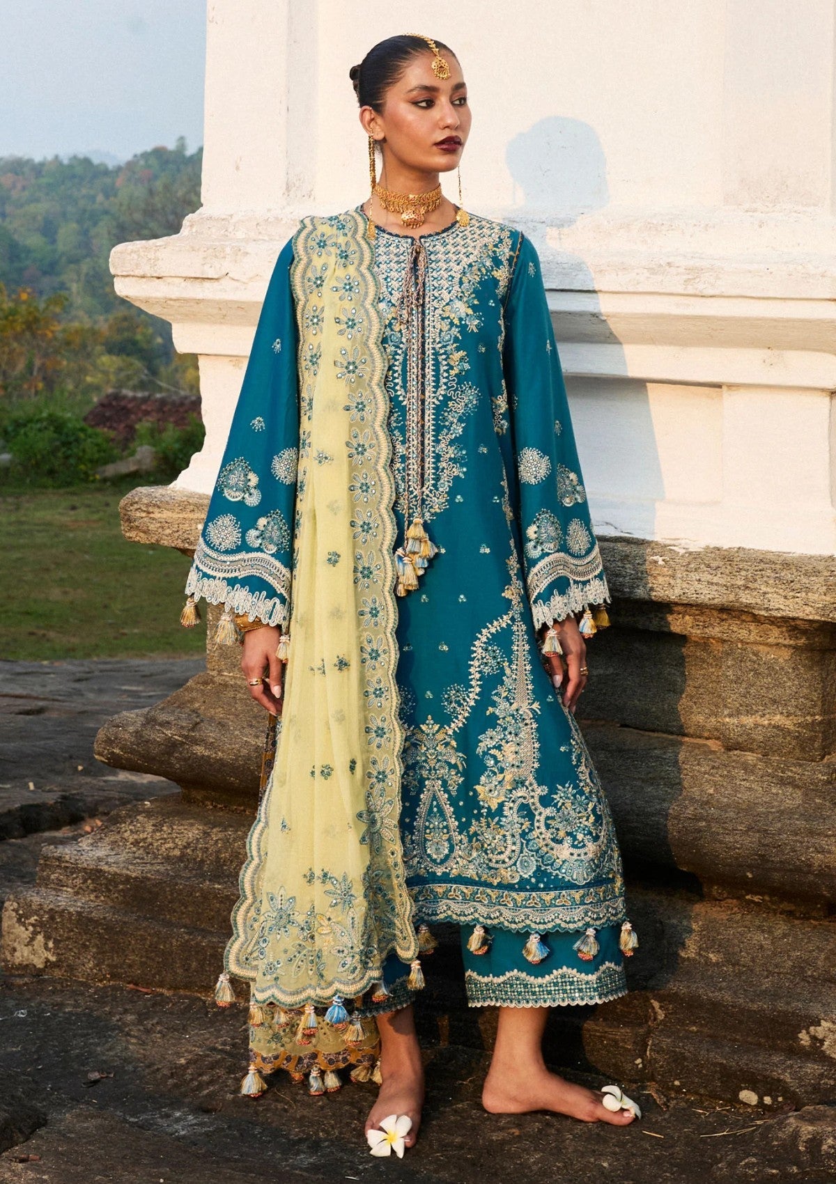 A stunning teal blue outfit serves as the base of the ensemble, providing a vibrant and eye-catching hue. The matching pants create a cohesive and polished look, perfect for summers. A teal-embroidered chiffon dupatta in apple green complements the outfit perfectly, adding a light, airy touch and emphasising the embroidery details.