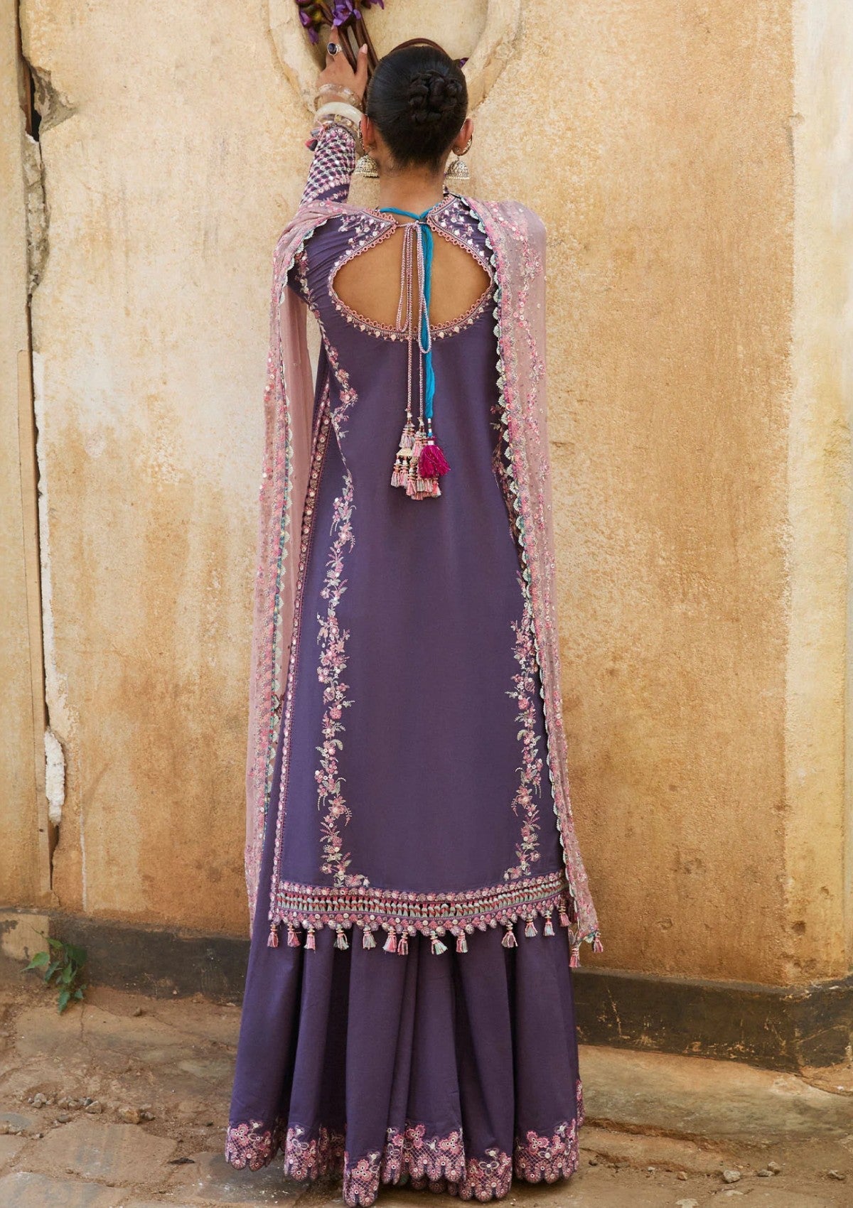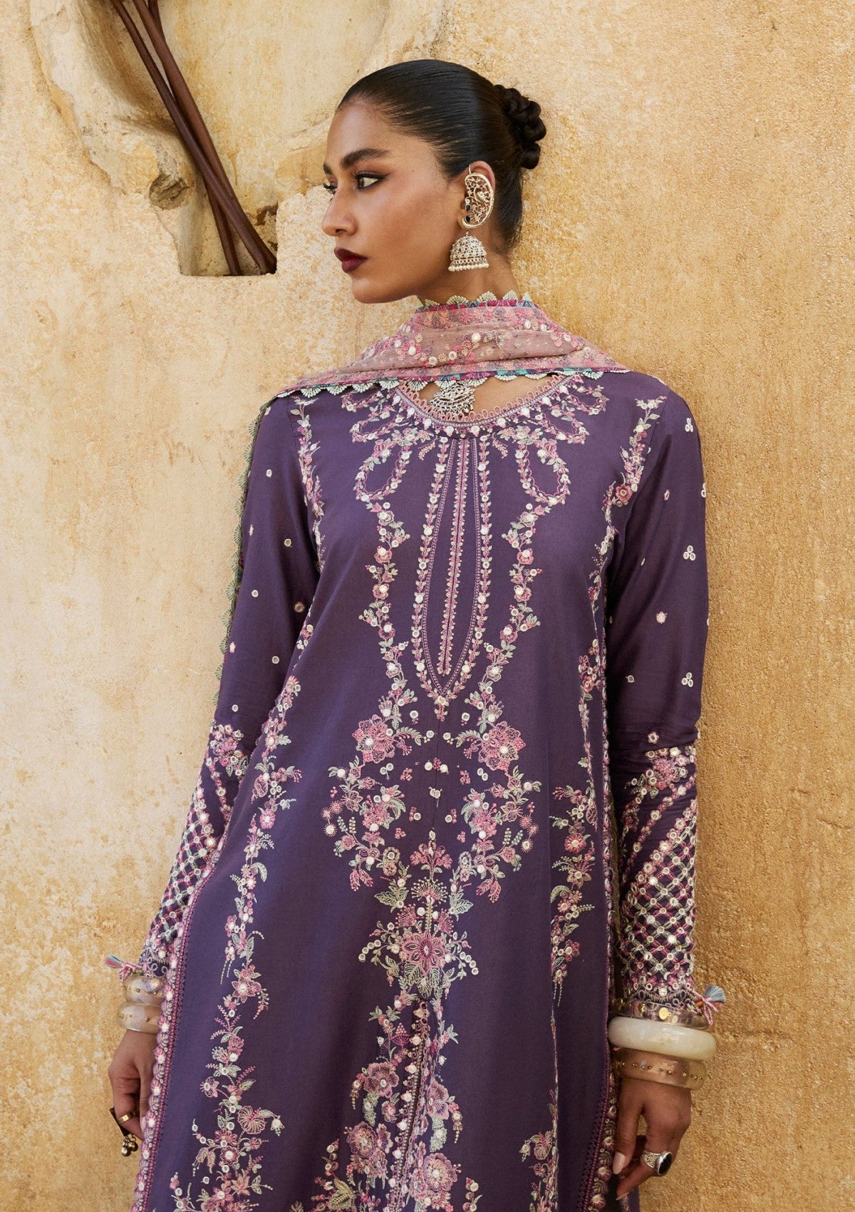 A purple ensemble presents a picturesque vision of rich tradition and sophistication, enhanced by meticulously executed embroidery on lawn fabric. Alluring floral motifs, combined with panni details in pink hues, lend an ethereal quality. The chiffon dupatta features complementary embroidery details. This traditional and elegant silhouette is completed by coordinating purple embroidered trousers.
