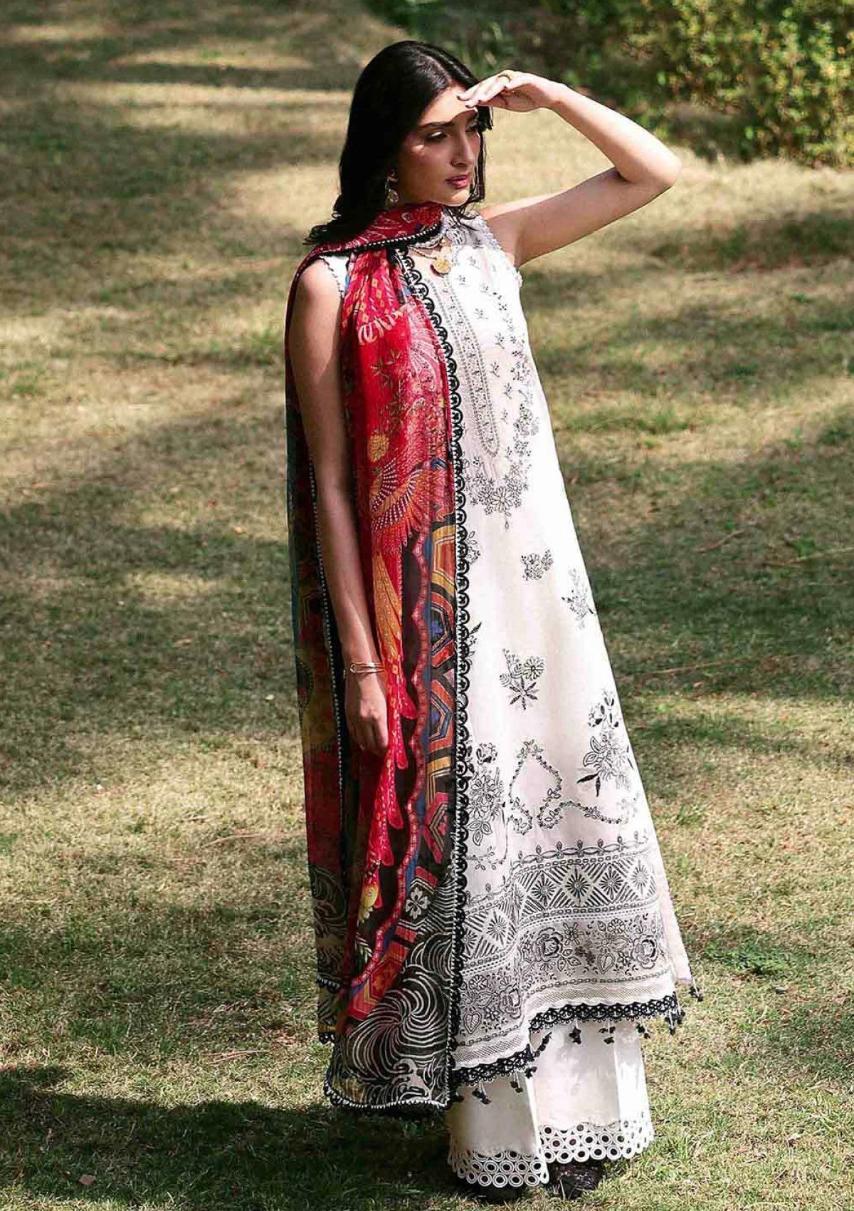 Exuding refined sophistication, this ensemble features a white base beautifully detailed with intricate black embroidery, creating a striking contrast. The look is elevated with a shikargah-themed chiffon dupatta in a bold red hue perfectly complementing the white canvas. Delicately adorned sleeves add a graceful finishing touch, blending timeless tradition with contemporary elegance.