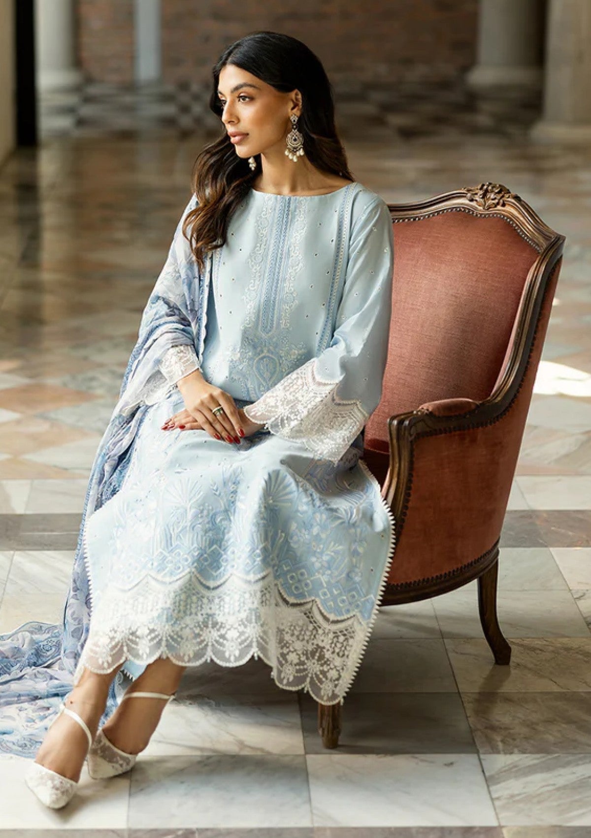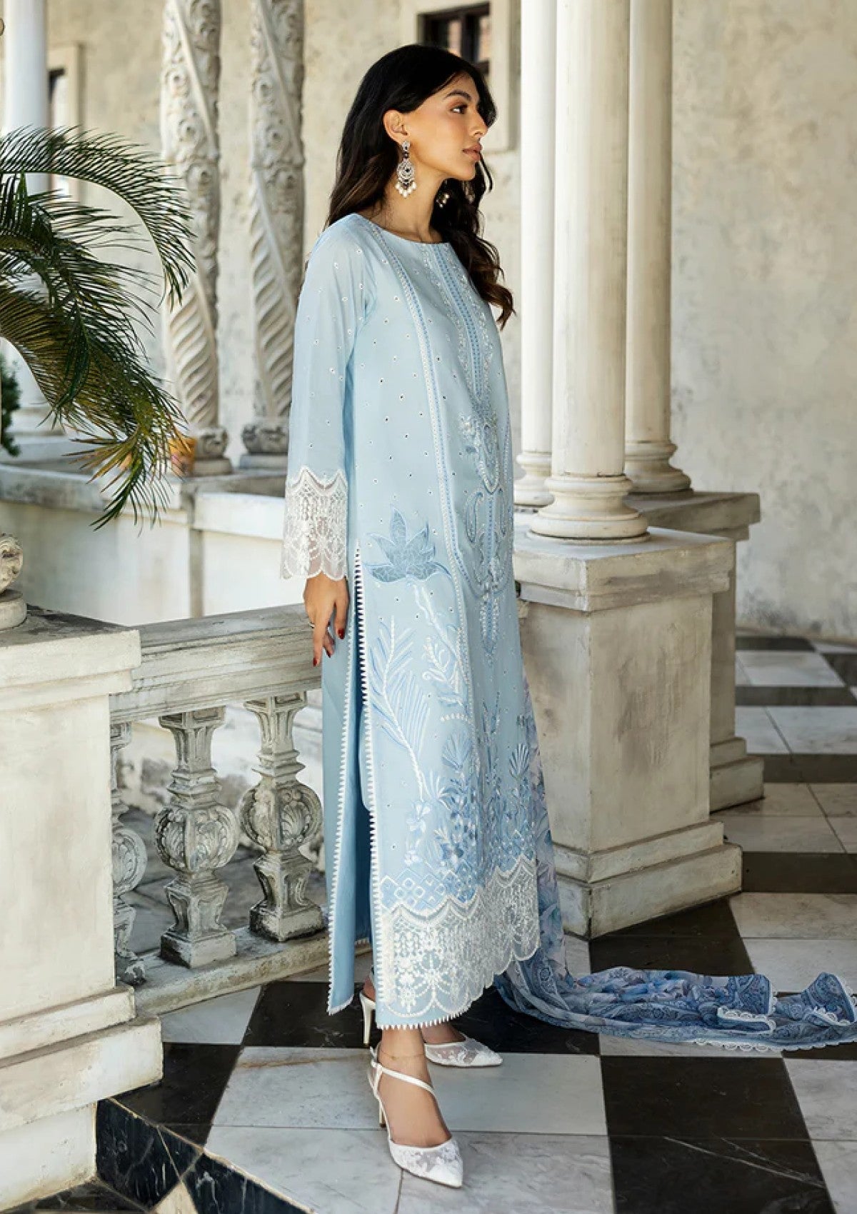 This exquisite soft light blue shirt adorned with intricate white chikankari embroidery. The delicate floral and traditional motifs are meticulously handcrafted, creating a mesmerizing play of light and shadow across the fabric. The neckline is further embellished with detailed embroidery, adding a touch of regal sophistication. A lightweight, flowing dupatta in a complementary pink shade drapes effortlessly, enhancing the ethereal charm of the ensemble. Coordinating blue trousers, tailored for a flattering silhouette, complete the look, making it perfect for both daytime elegance and evening soirees.