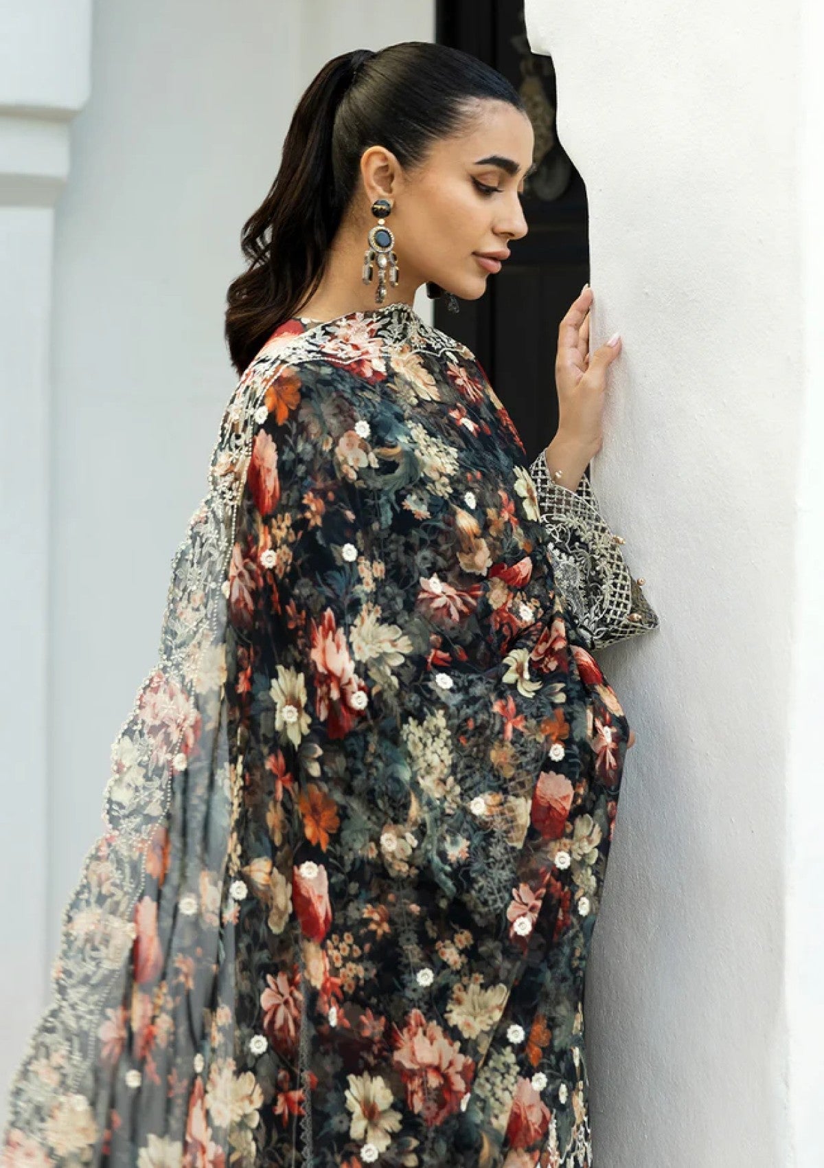 This stunning black 3-piece suit featuring a unique blend of floral print and intricate white chikankari embroidery. The detailed work adds a touch of traditional elegance to the modern design. Comes with a matching floral print chiffon dupatta.
