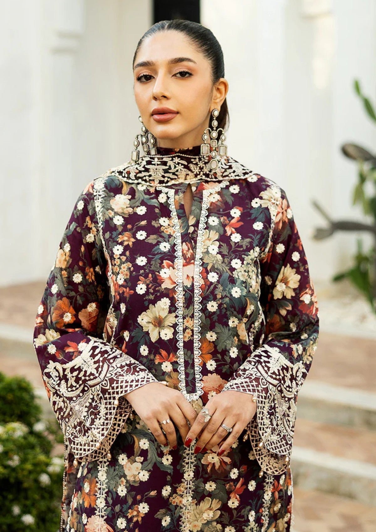 This stunning purple 3-piece suit featuring a unique blend of floral print and intricate white chikankari embroidery. The detailed work adds a touch of traditional elegance to the modern design. Comes with a matching floral print chiffon dupatta.