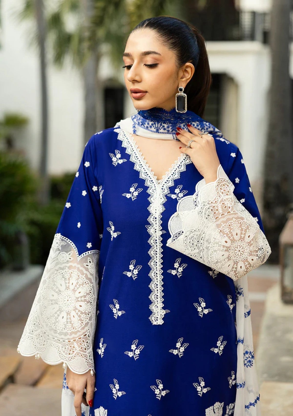 This elegant cobalt blue 3-piece suit showcases the timeless beauty of chikankari embroidery. The intricate white work delicately adorns the shirt, creating a captivating contrast against the subtle beige backdrop. The detailed patterns highlight the neckline, sleeves, and hemline, adding a touch of traditional charm. The accompanying chiffon dupatta features complementary embroidery, enhancing the overall sophistication of the ensemble.