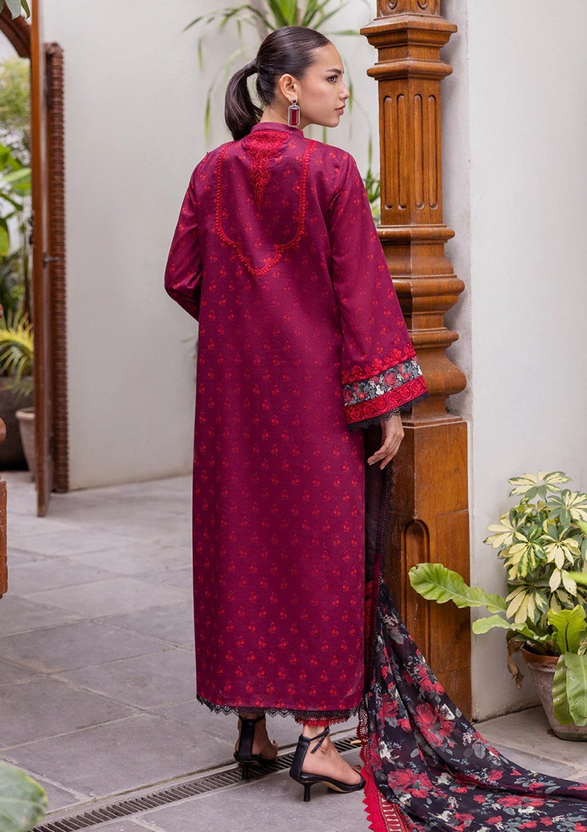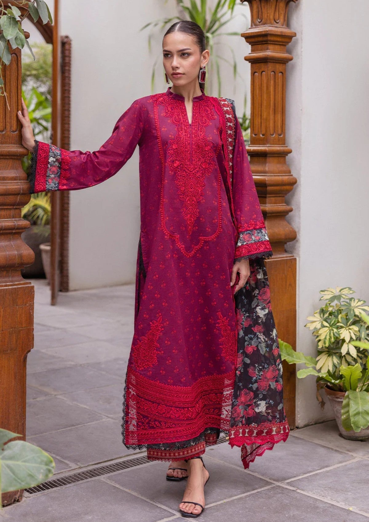 Experience scarlet grandeur with ayra, an unstitched piece from Zainab Chottani's exclusive Lawn Collection. The shirt is a vibrant statement in deep scarlet lawn, generously embellished with an all- over, intricate embroidery in matching red tones, creating a rich texture on the neckline, full sleeves, and detailed hemline. The final touch of opulence is added by the lightweight chiffon dupatta, which features a captivating print of lush red flowers on a dark, elegant background.