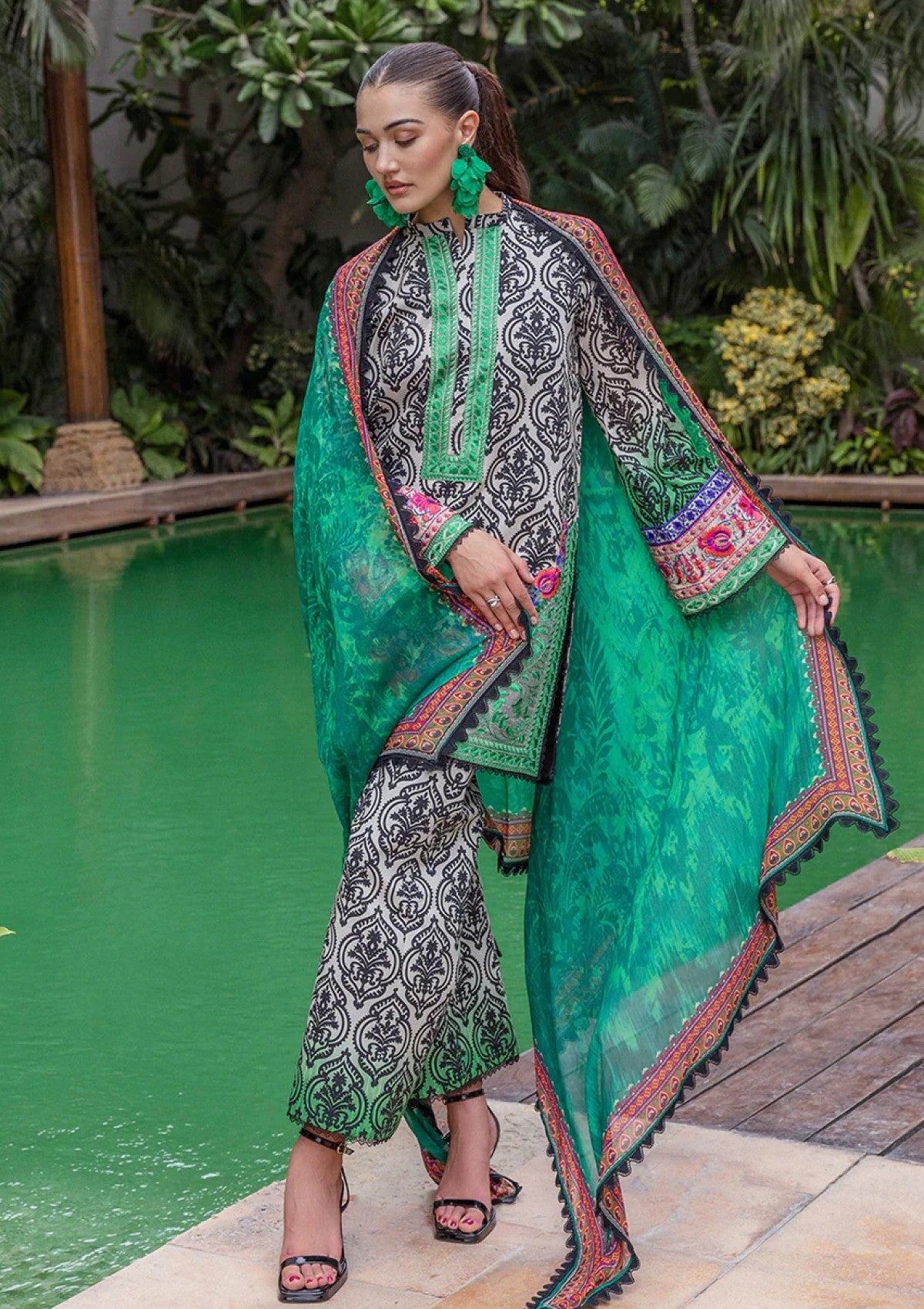 Discover the dramatic sophistication of Raya, an unstitched masterpiece from Zainab Chottani's latest Lawn Collection. Crafted from high-quality lawn, this design boasts a captivating play of rich black and refreshing teal floral prints. The detailed embroidery on the neckline, cuffs, and hem elevates the piece, adding a touch of refined artistry. Paired with matching pants and a gorgeous printed chiffon dupatta, Raya lets you create a unique, strong look.