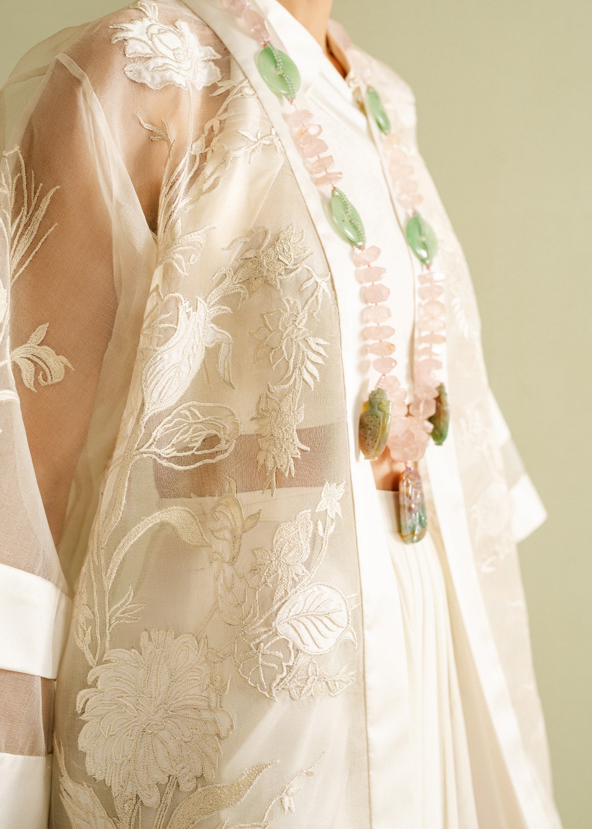Ayana from Ayanass Garden - a vision of timeless poise in ethereal ivory. This three-piece ensemble features a sheer organza jacket, delicately flowing over a self-jamawar blouse that radiates quiet opulence. Paired with a fluid chiffon sharara, the look is an ode to graceful movement and understated grandeur.