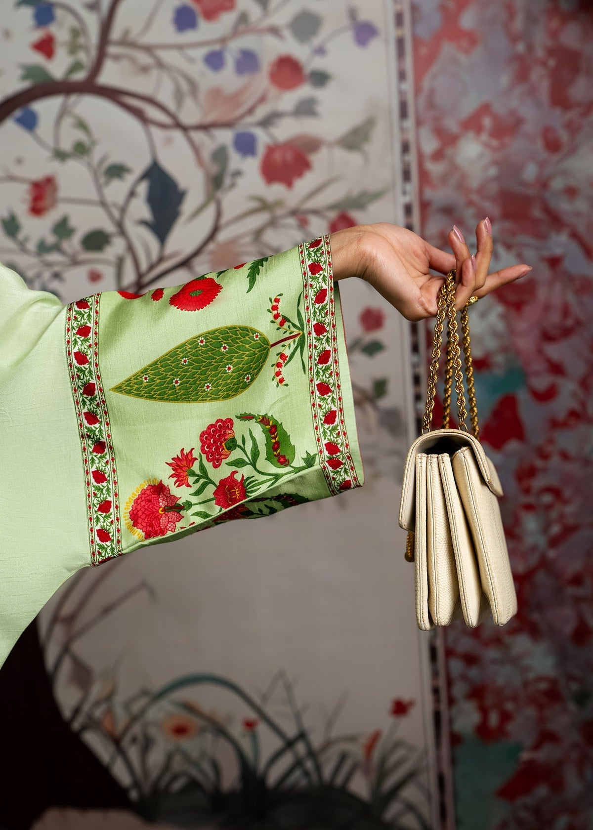 Amaya from Echoes of Elara is a refined expression of grace in a rich green hue. Crafted from luxurious Korean raw silk, the kurti is adorned with a delicate hand-worked motif on the neckline, showcasing exquisite craftsmanship. Paired with sleek raw silk printed trousers, this ensemble is a perfect blend of tradition and modern sophistication.